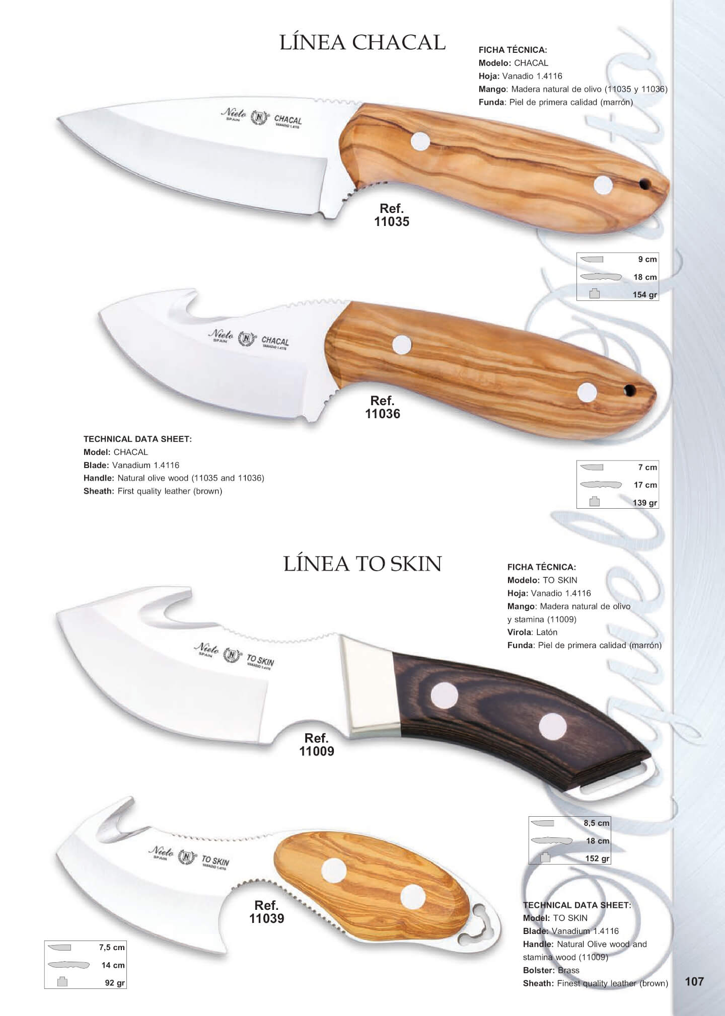 Pega de madeira natural de azeitona. Comprimento da lâmina: 9 cm. Comprimento total: 18 cm. Peso: 154 grs.