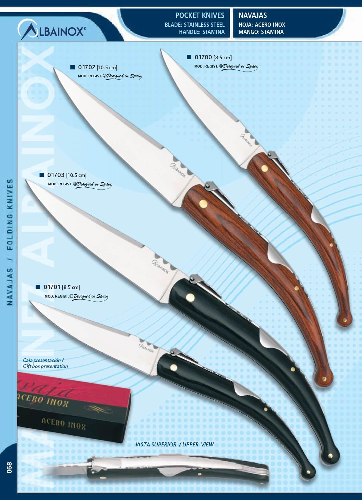 Canivetes com cabo resistente. Lâminas de aço inoxidável de 8,5 cm ou 10,5 cm. Cabo de madeira resistente vermelho ou preto. Bloqueio de "palanquilla".
