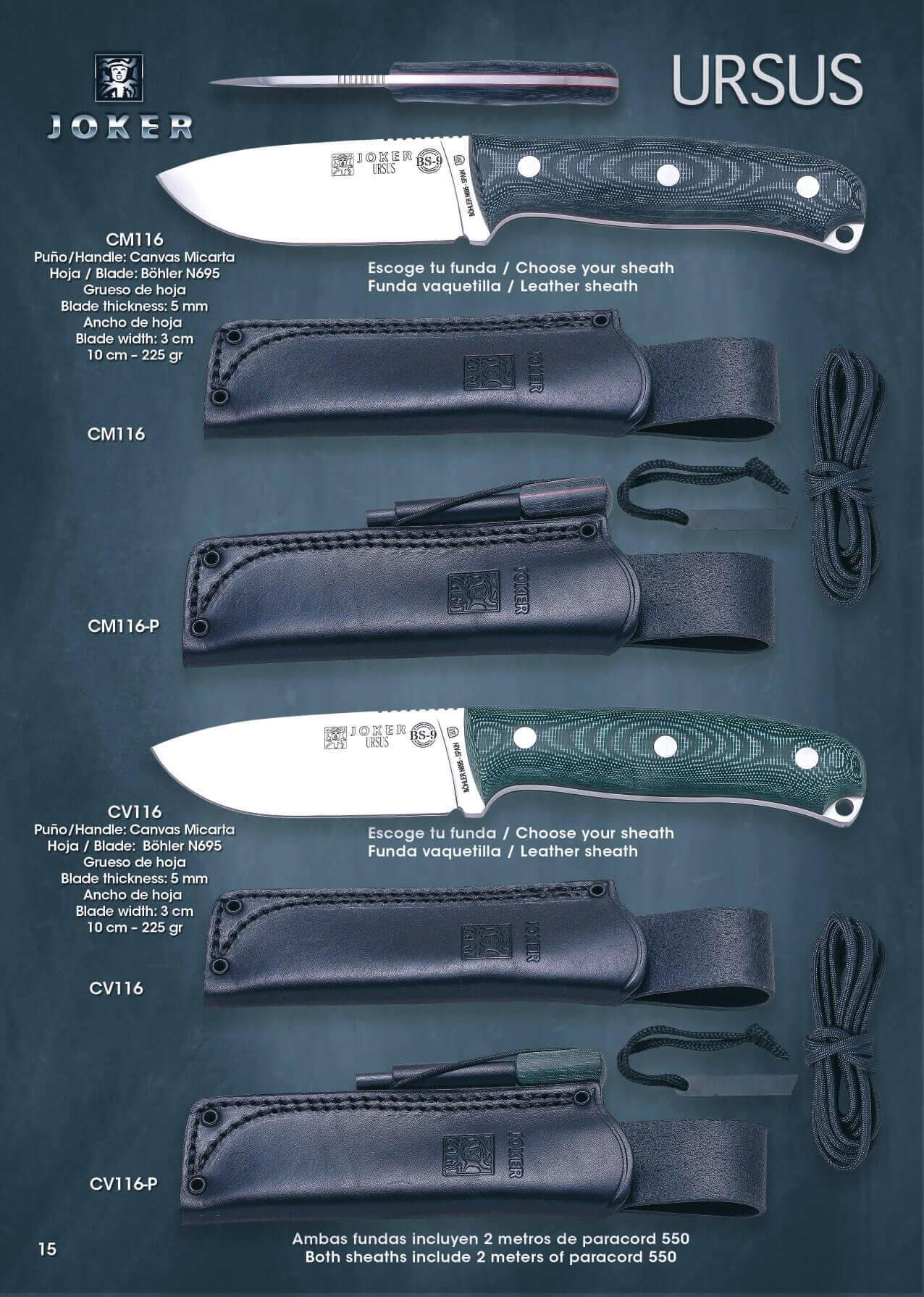 Pega: tela verde micarta. Folha: 10 cm. Case: couro