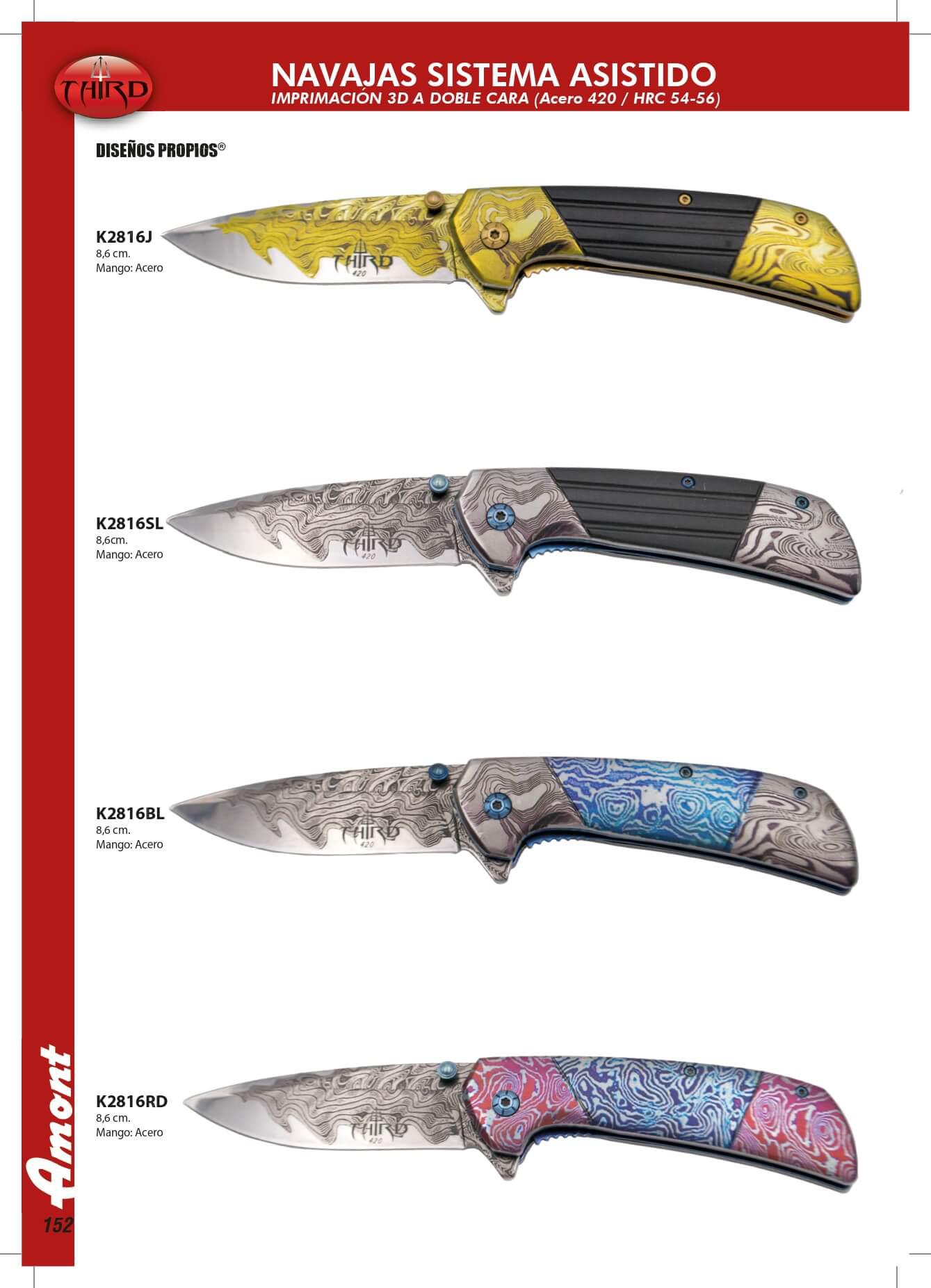 Canivetes com sistema de abertura assistida. Decorado com impressão 3D. Folha de 8,6 cm. Cabo de aço.