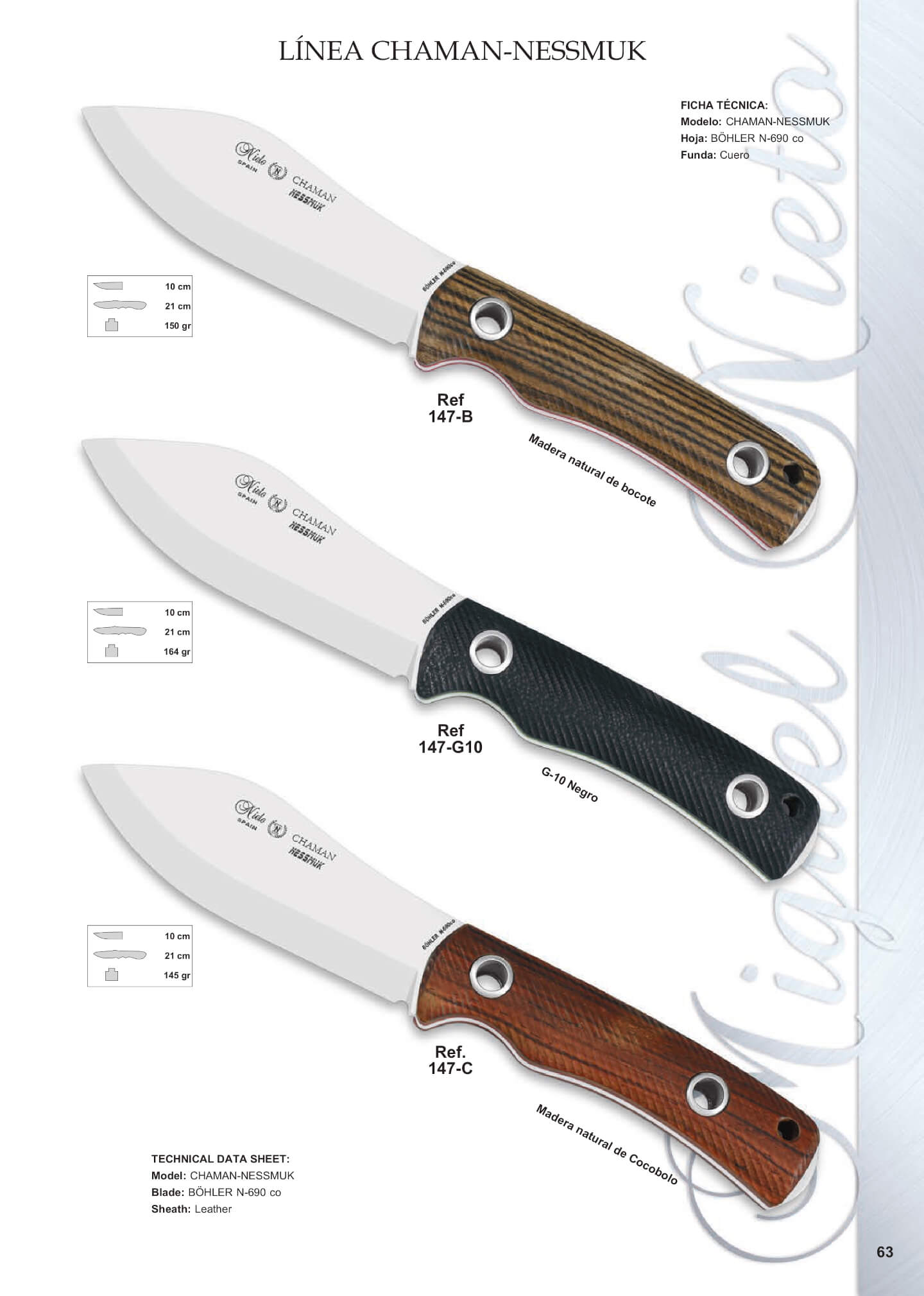 Faca de caça Nieto Chamán Nessmuk com lâmina de aço Böhler N690Co de 10 cm. Uma faca de caça com comprimento total de 21 cm. Inclui bainha de couro e furo para cordão.