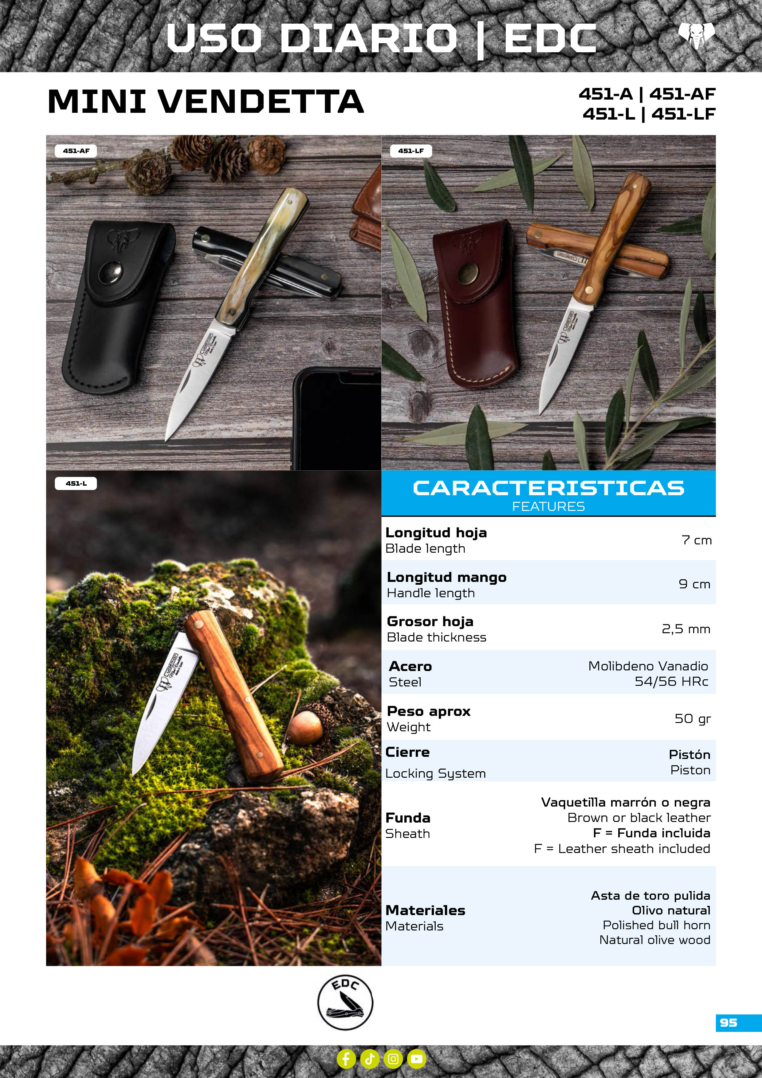 Canivetes de molibdênio em aço vanádio com lâmina de 7 cm. Comprimento total: 16 cm. Espessura: 2.5mm Largura da pá: 1,5 cm. Vedação do pistão Ponteiras de aço A-304. Cabos de madeira de cocobolo, madeira de oliveira ou chifre de touro.