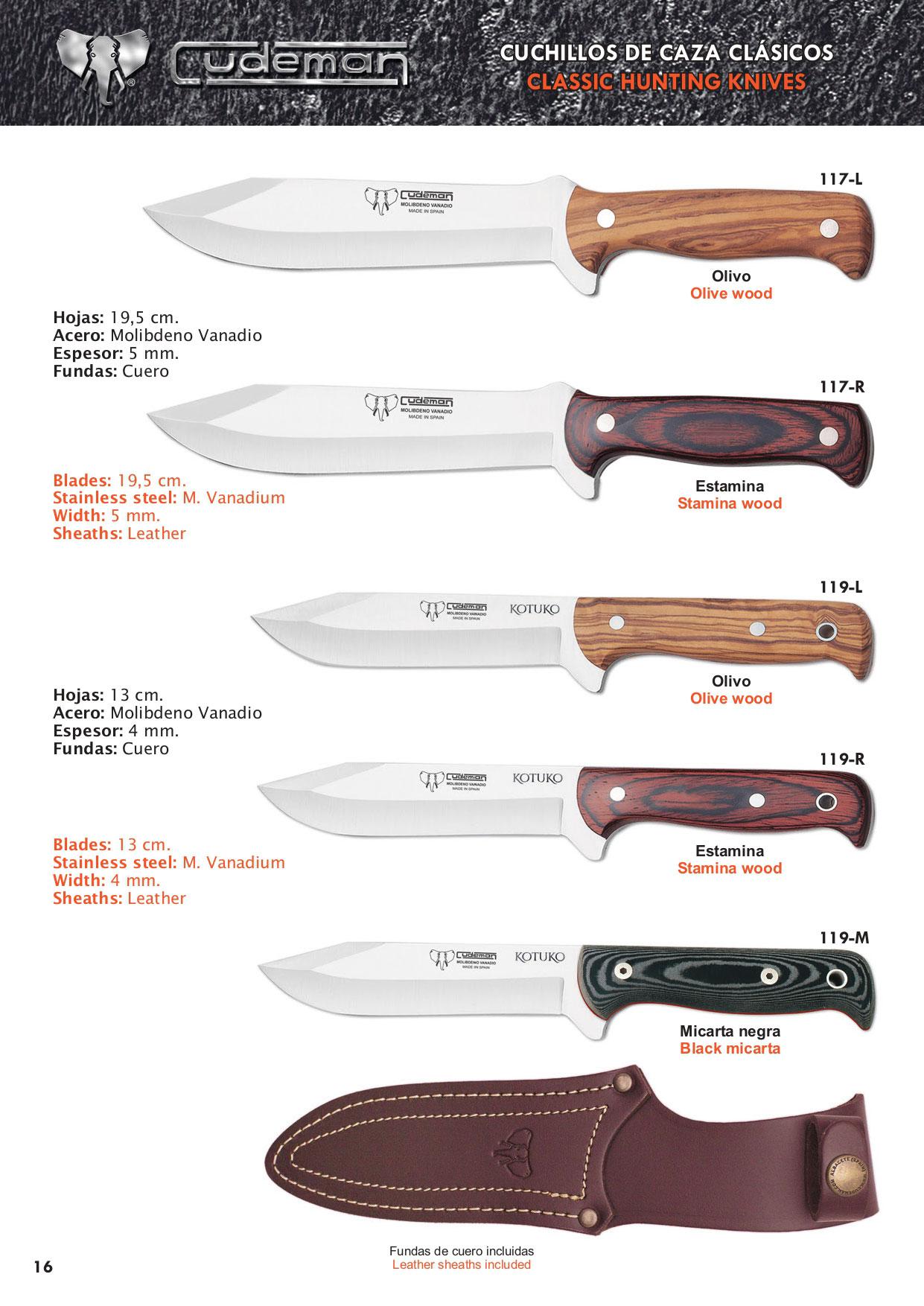 119: KOTUKO Faca completa com lâmina de aço molibdênio-vanádio. Comprimento da lâmina: 13,5 cm. Comprimento total: 25 cm. Espessura da lâmina: 4mm. Largura da pá: 3,5 cm. Lâmina com recesso côncavo e ponta de ponto de gota. Estojo de couro marrom incluído.
