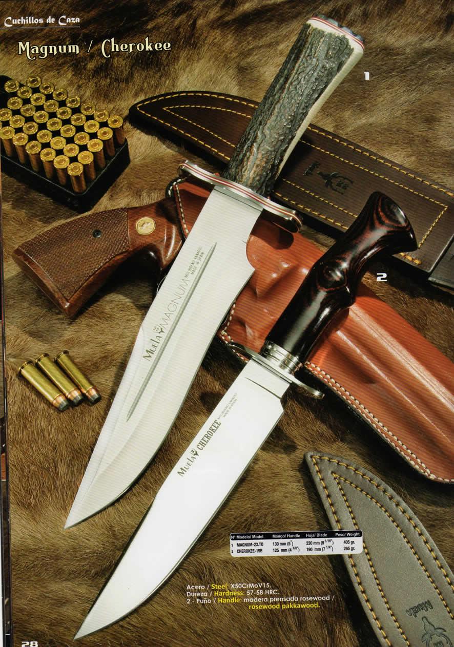 Faca tipo Bowie com lâmina de aço molibdênio vanádio de 23 cm. Comprimento total 36 cm. Cabo em chifre de veado com resguardo em aço inoxidável. Inclui capa de couro marrom. Peso 420 gr.