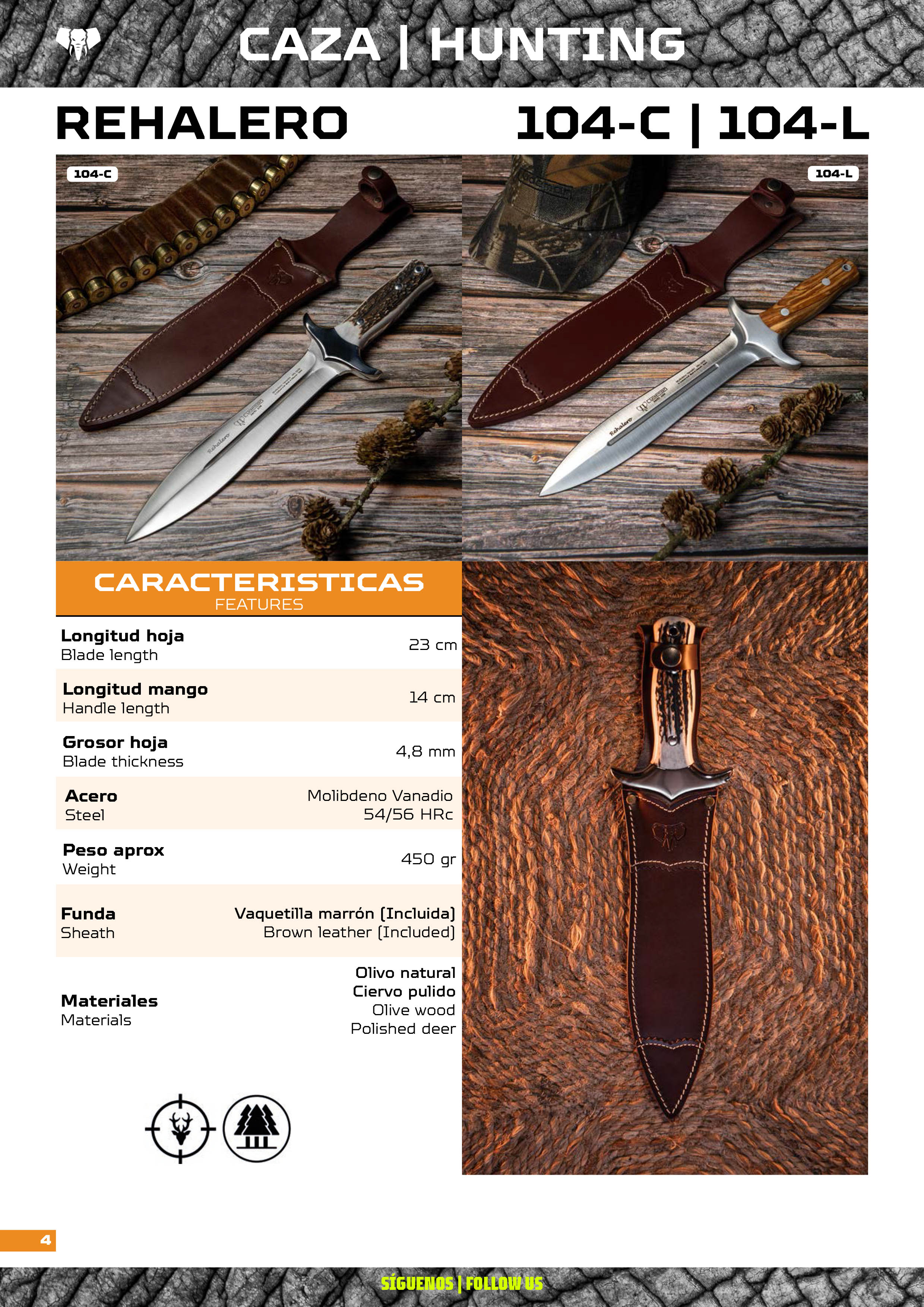 Comprimento da lâmina: 24 cm. Comprimento total: 38 cm. Espessura da lâmina: 5mm. Largura da pá: 4,2 cm. Ponteira de aço A-304. Lâmina com recesso côncavo e acabamento acetinado. Estojo em couro incluído.