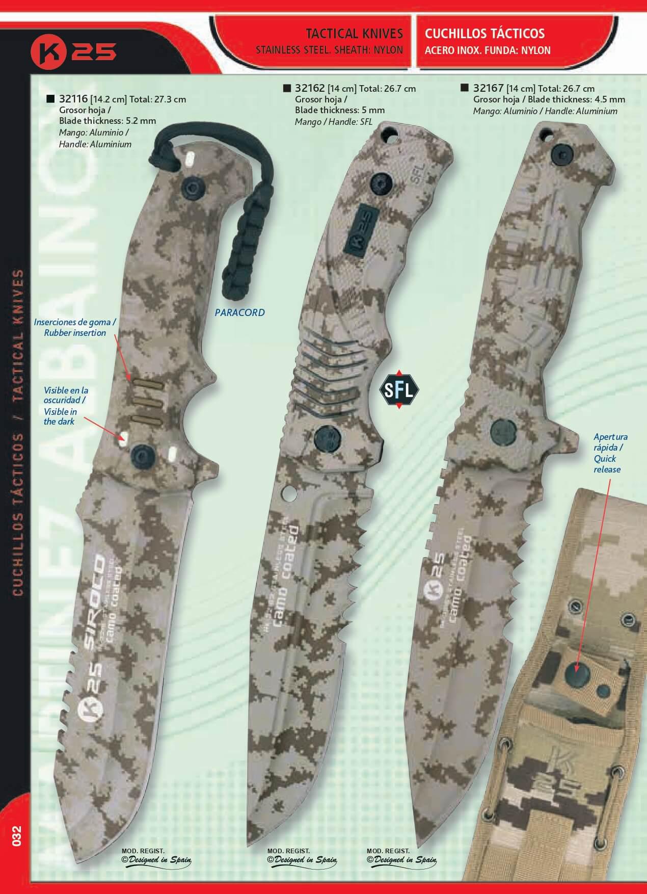 Faca K25 com cabo SFL camuflado, bainha de nylon e lâmina serrilh...