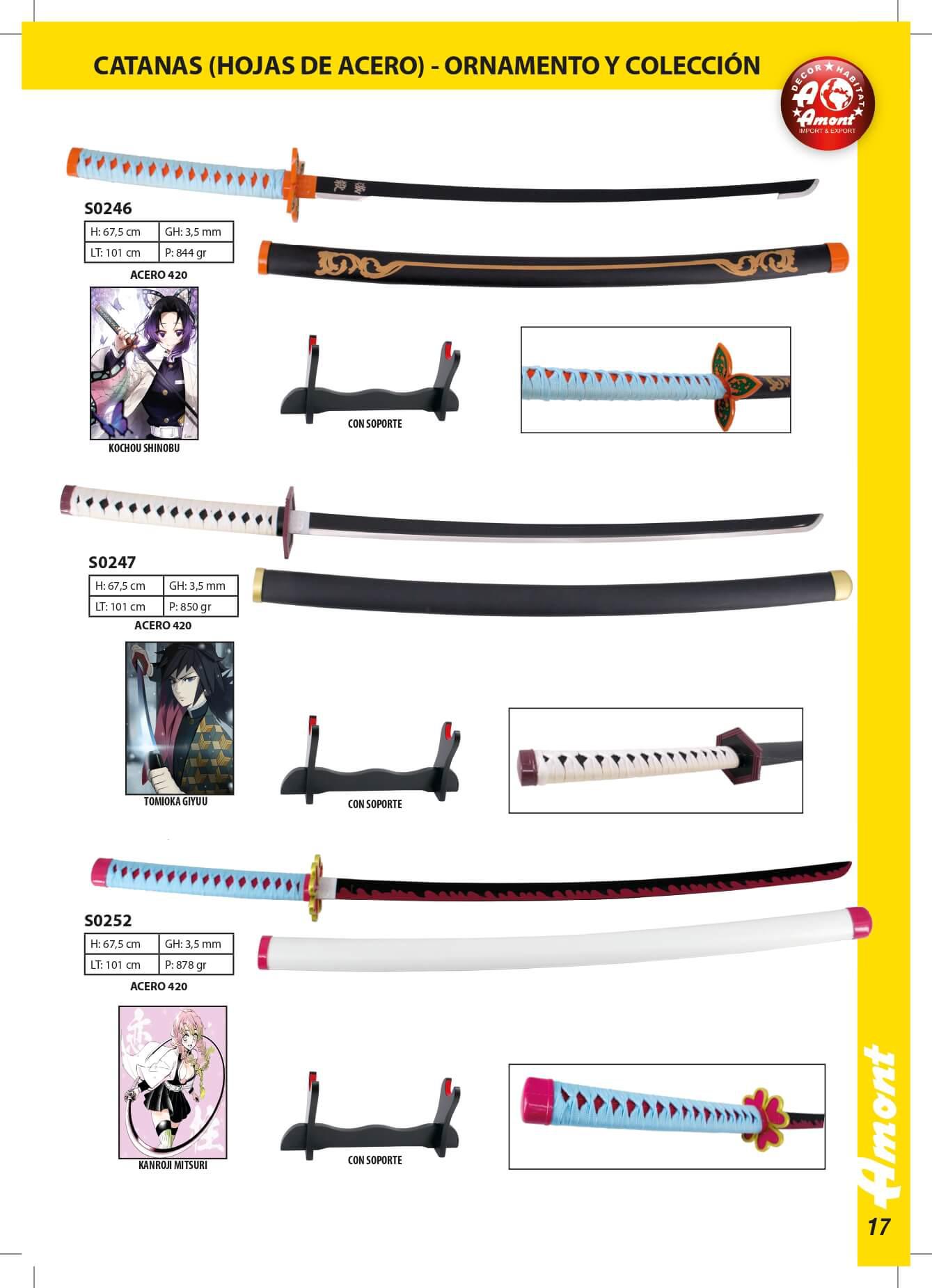 Katanas Demon Slayer Katanas Demon Slayer Comprimento da lâmina: 67,5 cm. Comprimento total: 101 cm. - S0246: Kochou Shinobu - S0247: Tomioka Giyuu - S0248: Kanrojimitsuri Katanas inclui suporte.