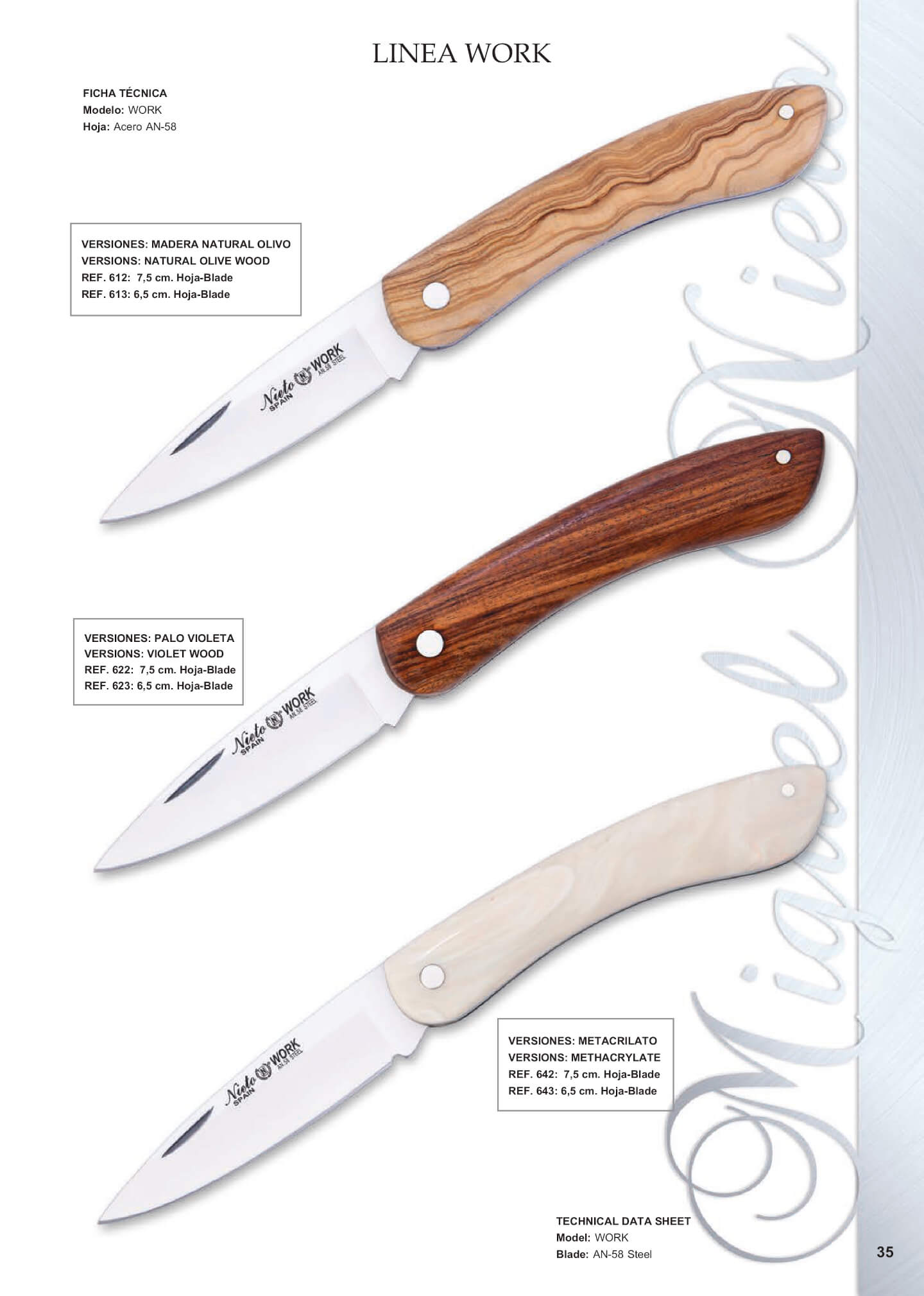 Pega: madeira de oliveira natural. Folha: 9 cm. Comprimento total: 20 cm. Peso 65 gr.