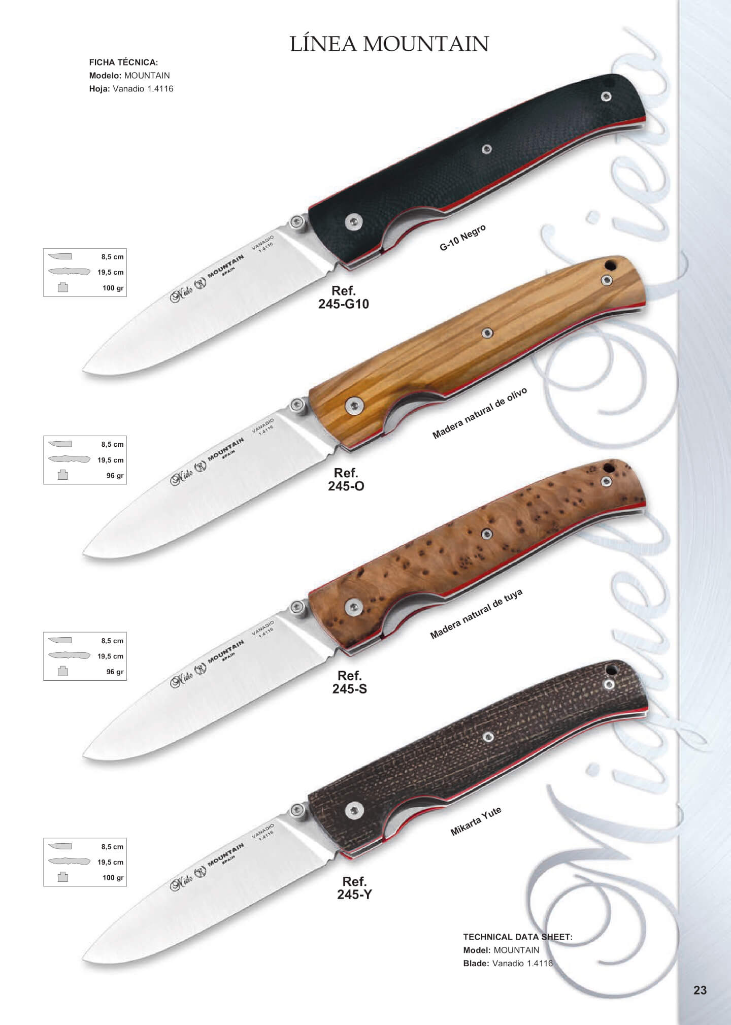 Nieto Mountain Pocket Knives Estilo drop-leaf de folha no aço MoVa 1.4661, com pivô para fácil abertura com uma mão. Sistema de travamento de bloqueio de forro. Comprimento da folha: 8,5 cm. Comprimento total: 19,5 cm. Espessura da lâmina: 3,5 mm.