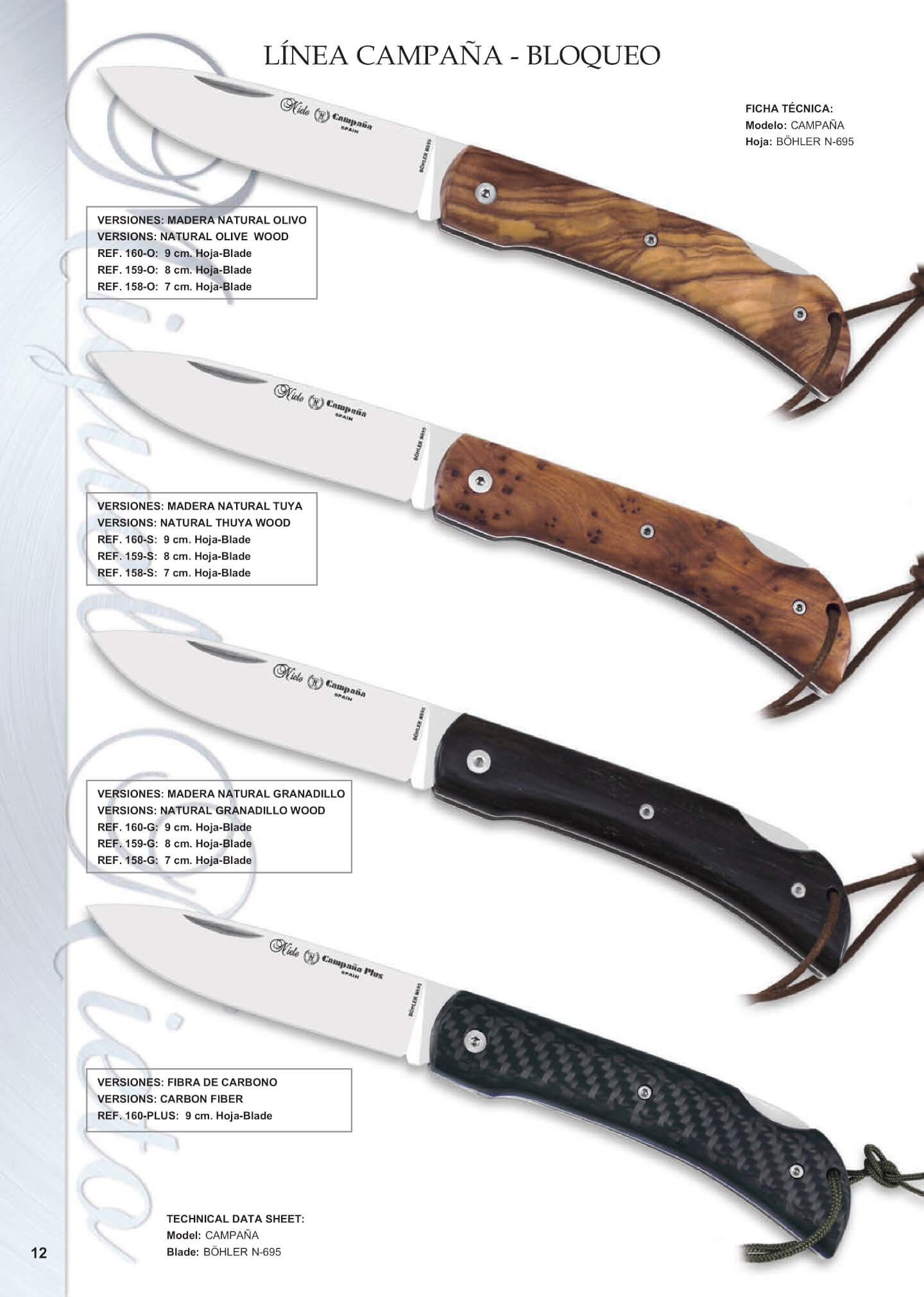 As facas dobráveis "Nieto campaign" são projetadas e fabricadas na Espanha por Miguel Nieto. Estas facas dobráveis práticas e úteis são feitas com o aço BÖHLER N-695, German Steel, que tem um ótimo prestígio devido à sua reconhecida qualidade e dureza. Seu design elegante e variedade de tamanhos torna essas facas dobráveis o melhor parceiro para os paisagens ao ar livre, mas também para as tarefas diárias