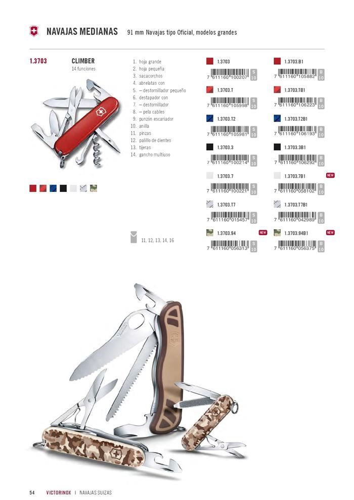 lâmina grande, lâmina pequena, abridor de latas, chave de fenda de 3 mm, abridor de garrafas, chave de fenda de 6 mm, removedor de fios, perfurador alargador, saca-rolhas, tesoura, gancho multiuso, palito, pinça, anel.
