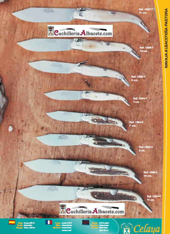 Navaja clásica albaceteña "pastora" con hoja de acero de carbono o acero inoxidable. Mangos en asta de toro o asta de ciervo. Virola de aluminio