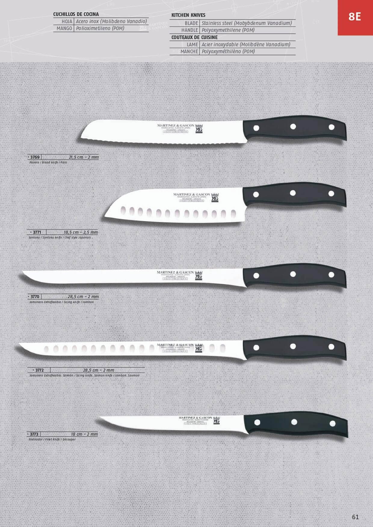 Cuchillos de cocina con hoja de acero inoxidable Molibdeno Vanadio. Mangos de polioximetileno (POM).