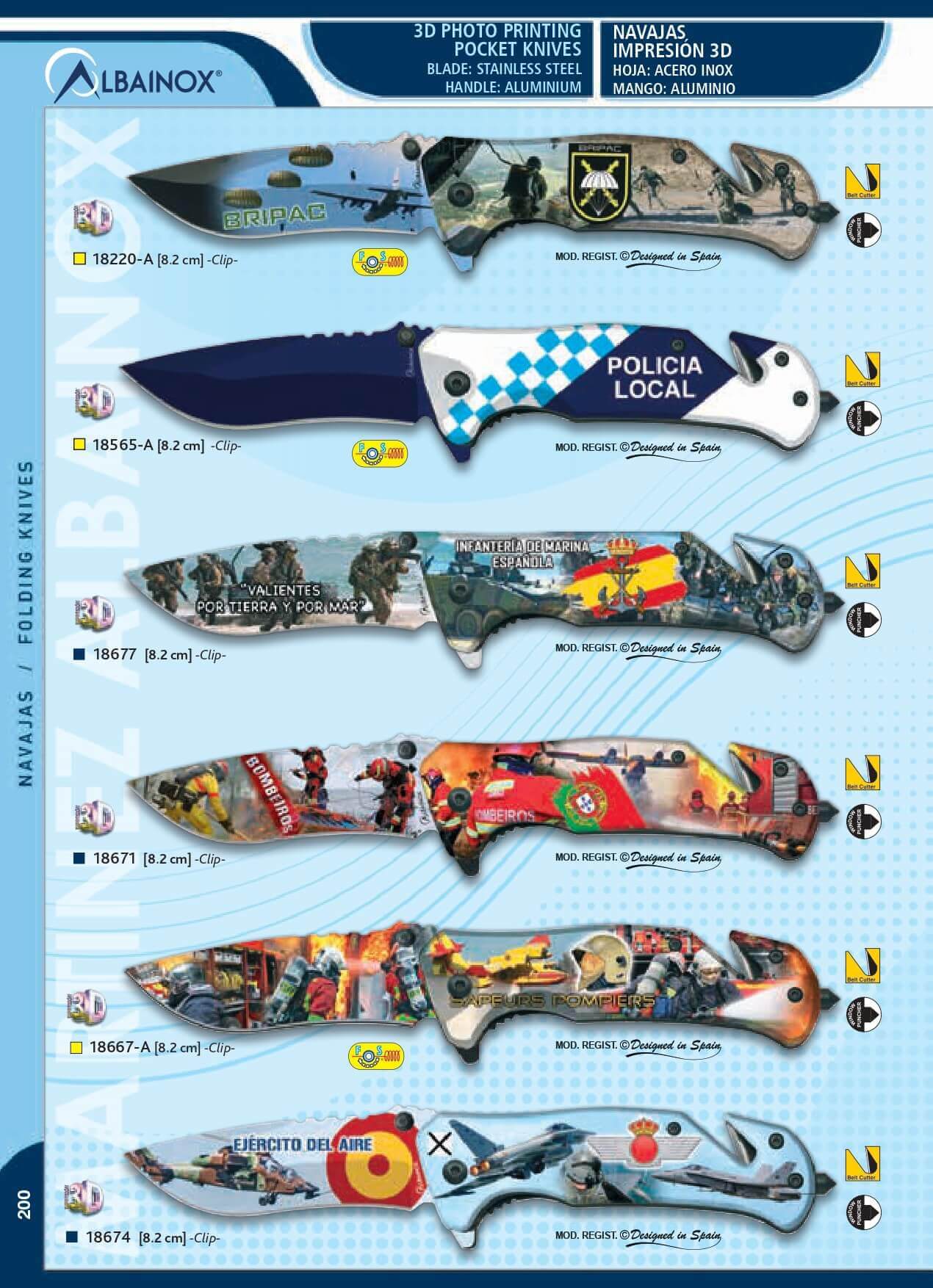 Navajas tácticas con corta-cinturón y punta rompe vidrios.Navajas de impresión 3D: Hojas de acero inox de 8.2 cm.Bloqueo de línea.