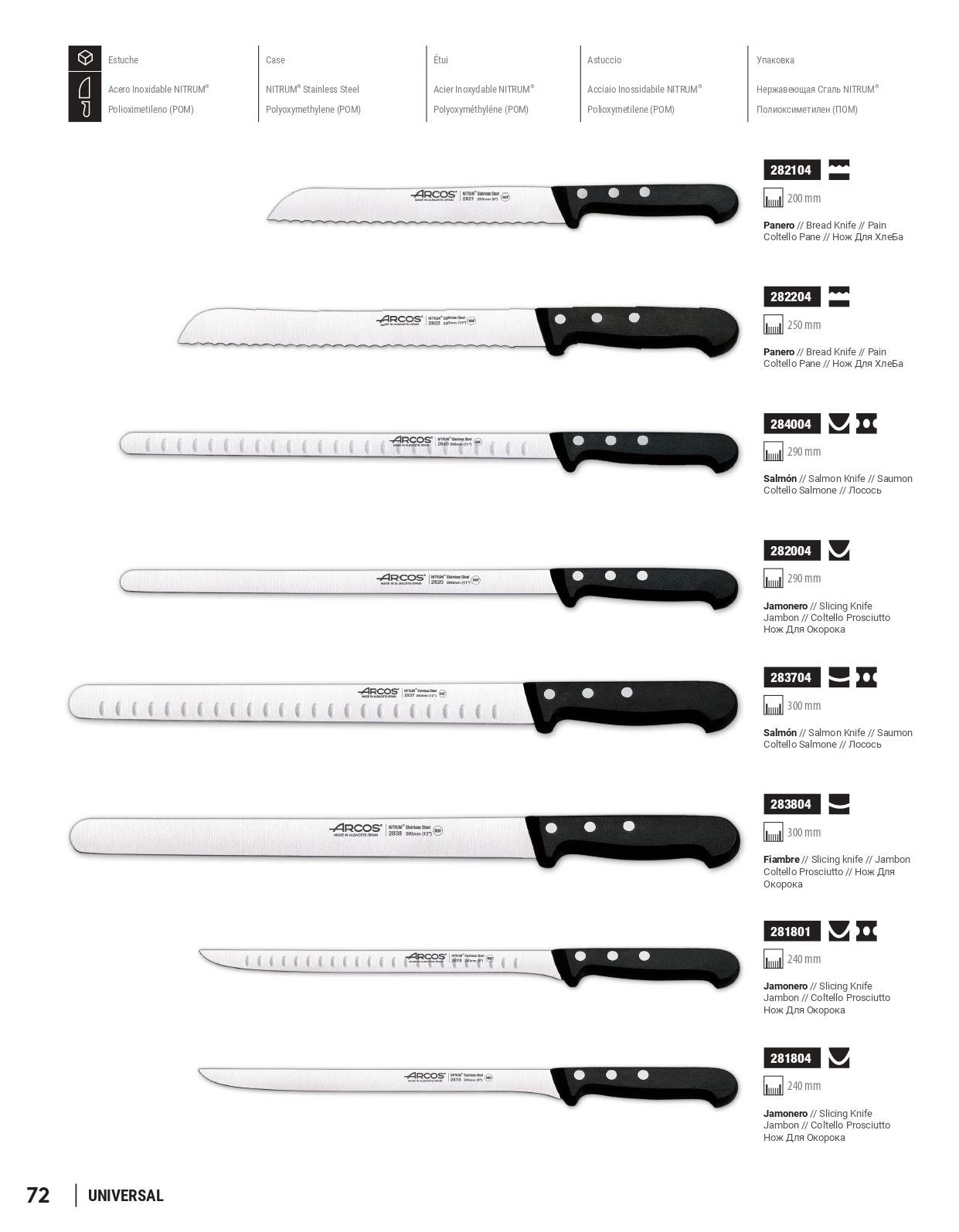 Cuchillos profesionales de cocinero y carnicero. Cortar jamon. Hoja de acero inoxidable NITRUM. Mango POM. Serie UNIVERSAL.