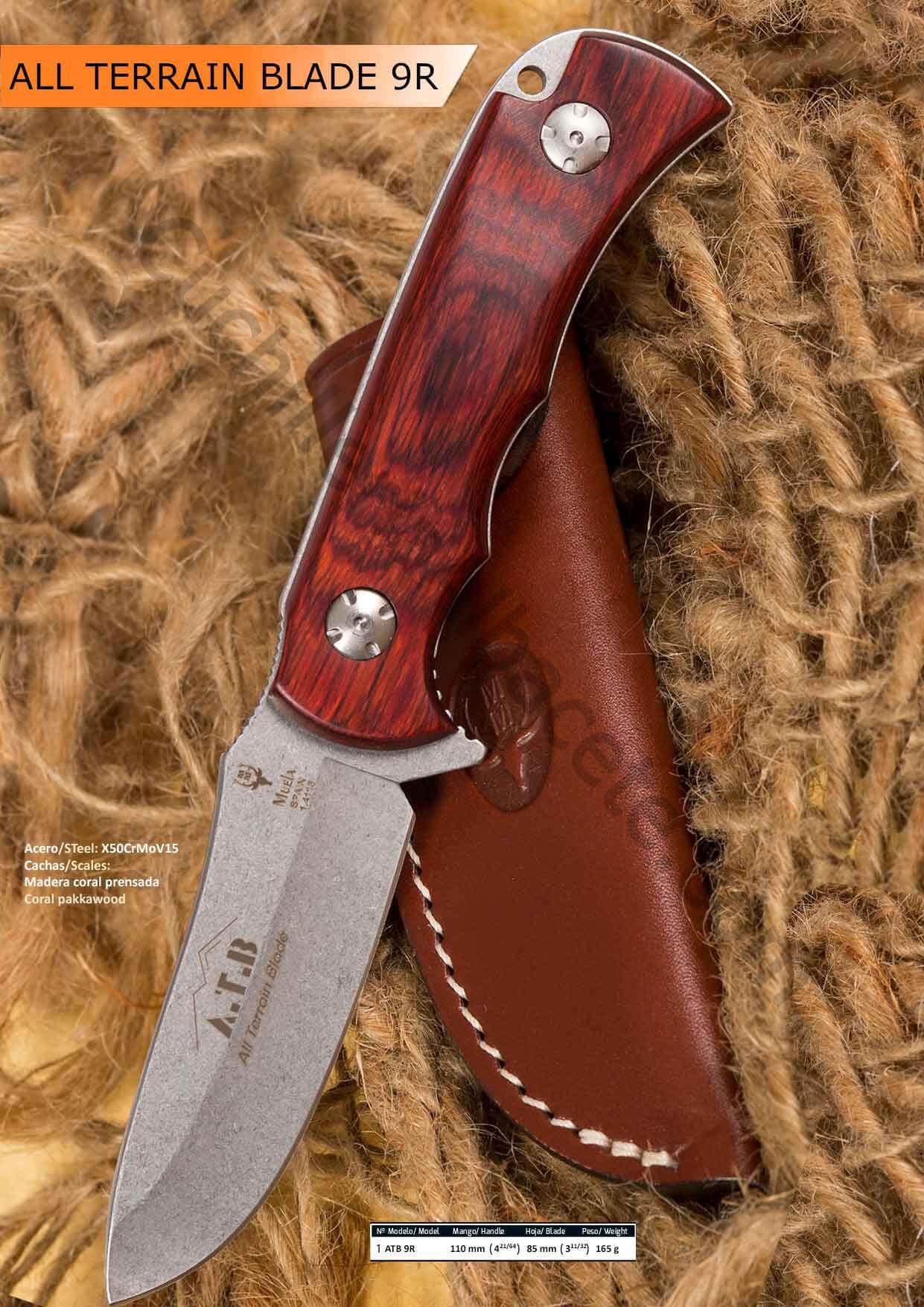 Cuchillo con la hoja de acero MOVA satinada mediante lavado a la piedra y tratamiento CRYO-T (con temperaturas criogénicas). Cachas de madera prensada coral. Longitud de hoja 9 cm. Espesor de hoja 4 mm.