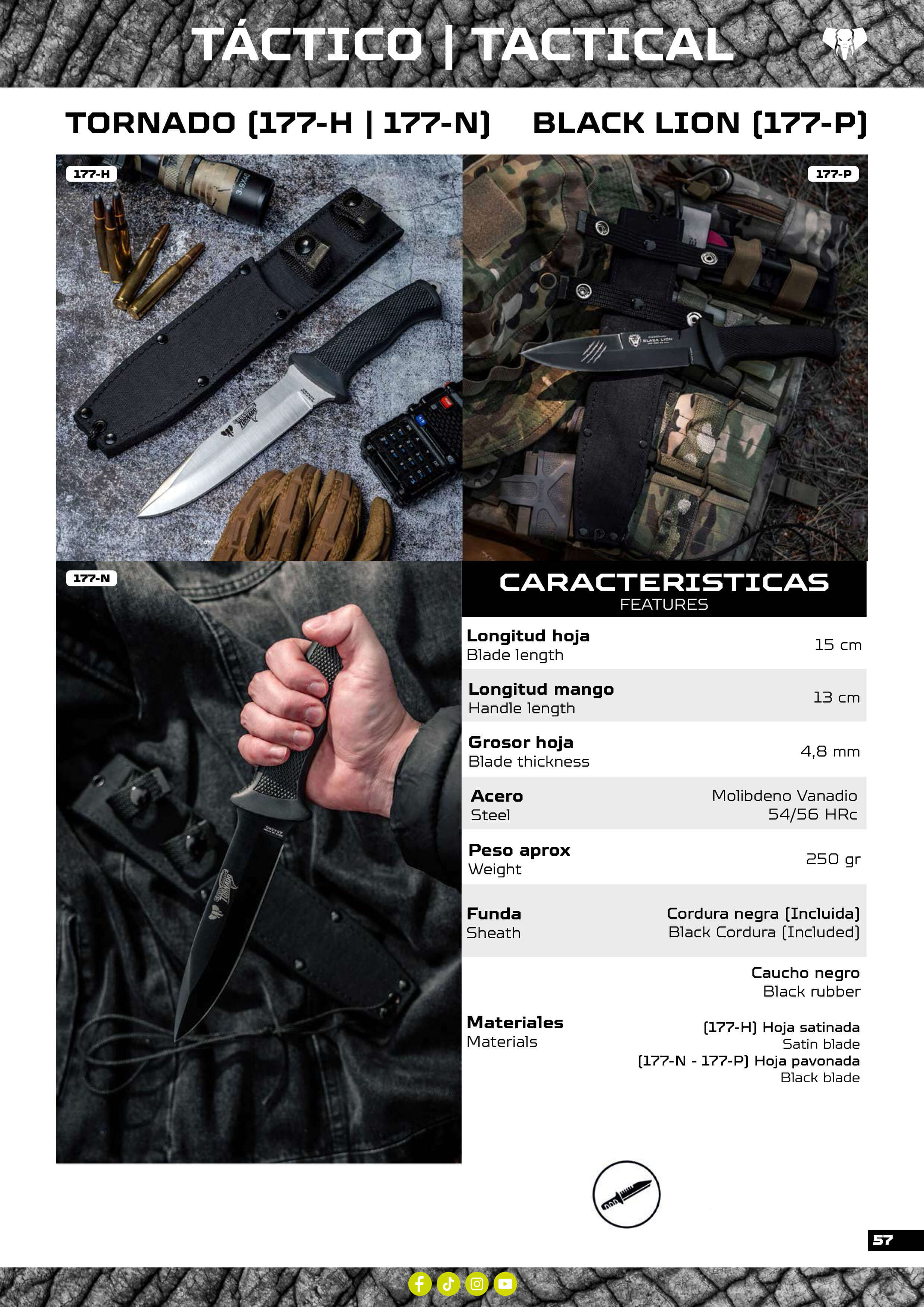 Longitud de hoja: 15 cm. Longitud total: 27 cm. Grosor de hoja: 5 mm. Ancho de pala: 3 cm. Peso: 244 gr. Funda de cordura negra.