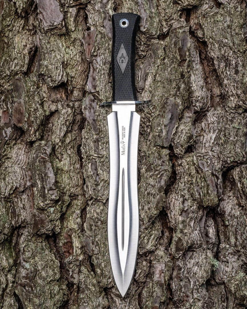 Cuchillo de remate Bowie 24 con hoja de acero Molibdeno Vanadio de 24,5 cm de doble filo, con sangrador. Mango de goma con defensa de acero inoxidable para un mejor agarre y un menor peso.