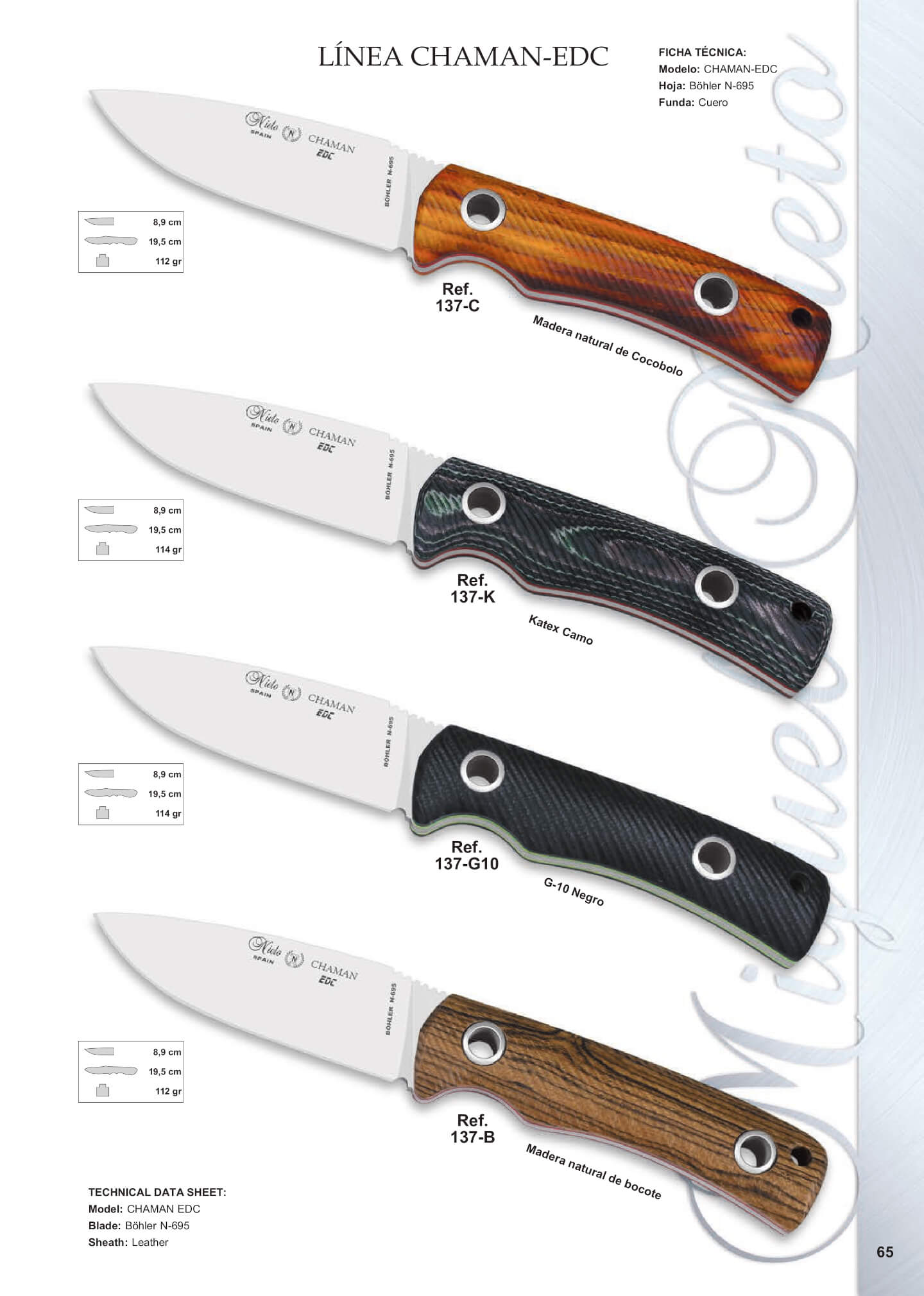CHAMAN EDC. Hoja: acero Böhler N695. Funda de cuero incluida. Medidas: Longitud de Hoja: 9 cm. Longitud total: 19.7 cm. Peso: 110 gr. 137-C Mango: cocobolo. 137-G10 Mango: G10. 137-K Mango: Katex negro.