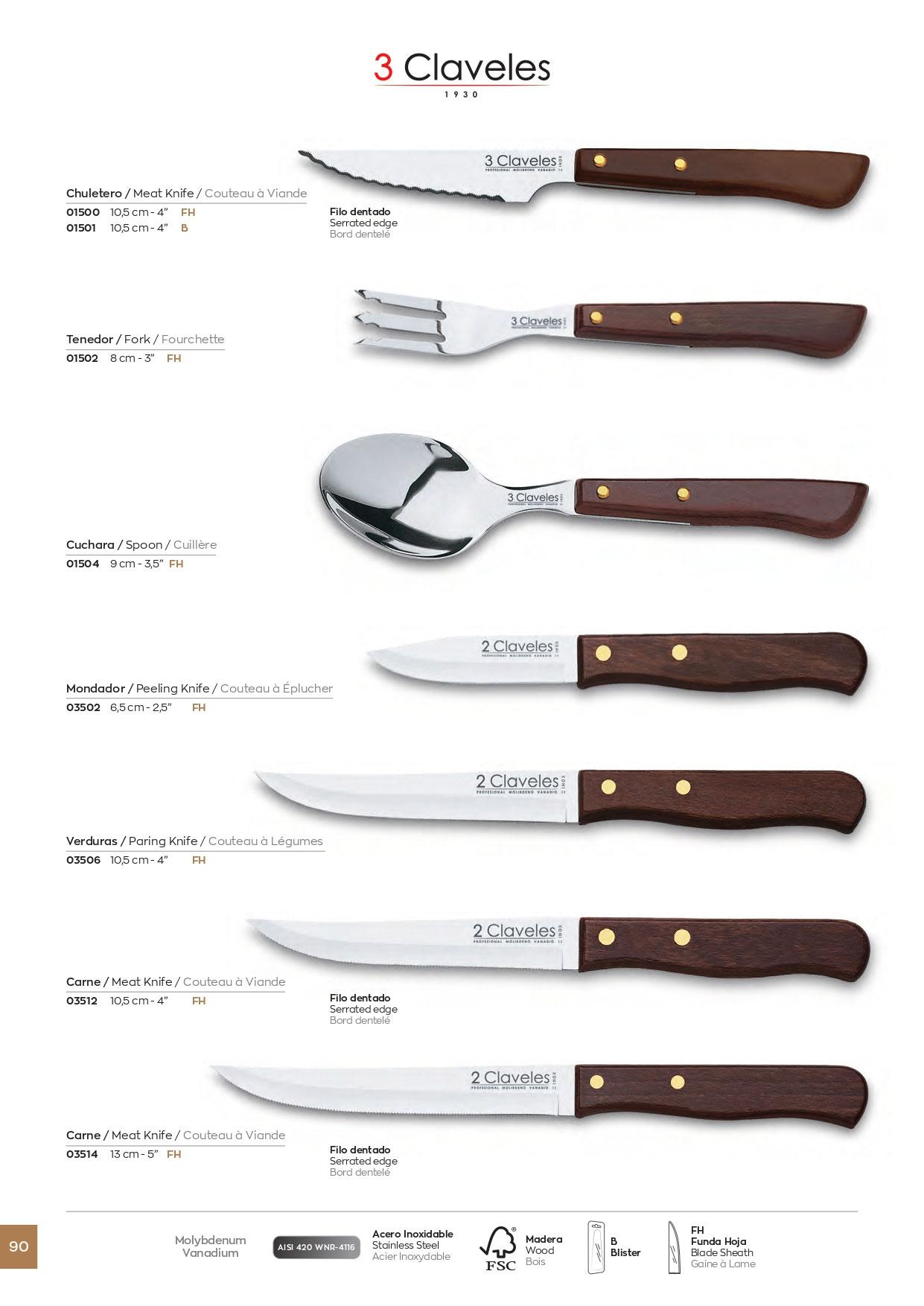 Cuchillos y Cubiertos de mesa Acero Inoxidable y mango de madera comprimida. Cuchillo, Tenedor y Cuchara, mondador, verduras, carne.