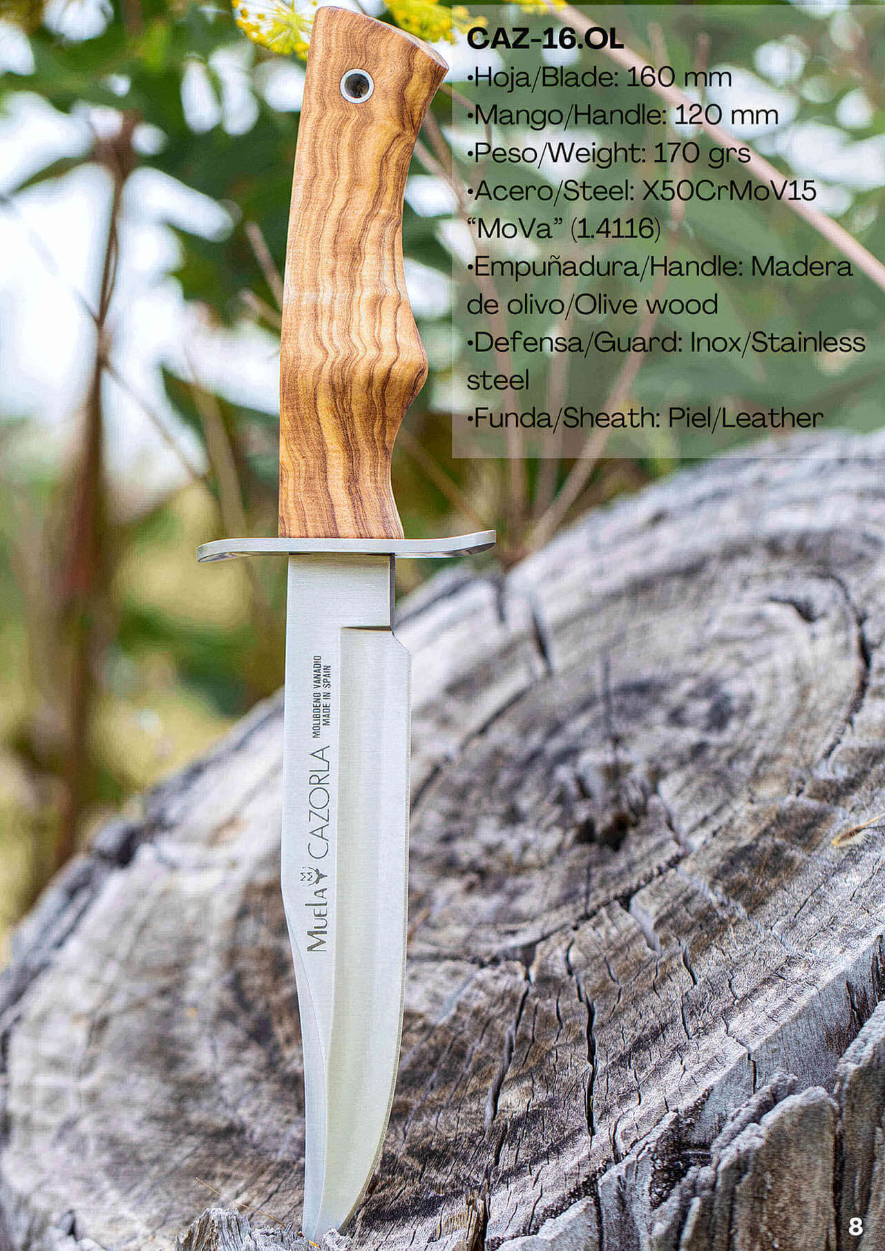Un cuchillo de caza con hoja tipo bowie de 16 cm. Mango de madera de olivo con defensa de acero inoxidable. Incluye funda de cuero marrón.