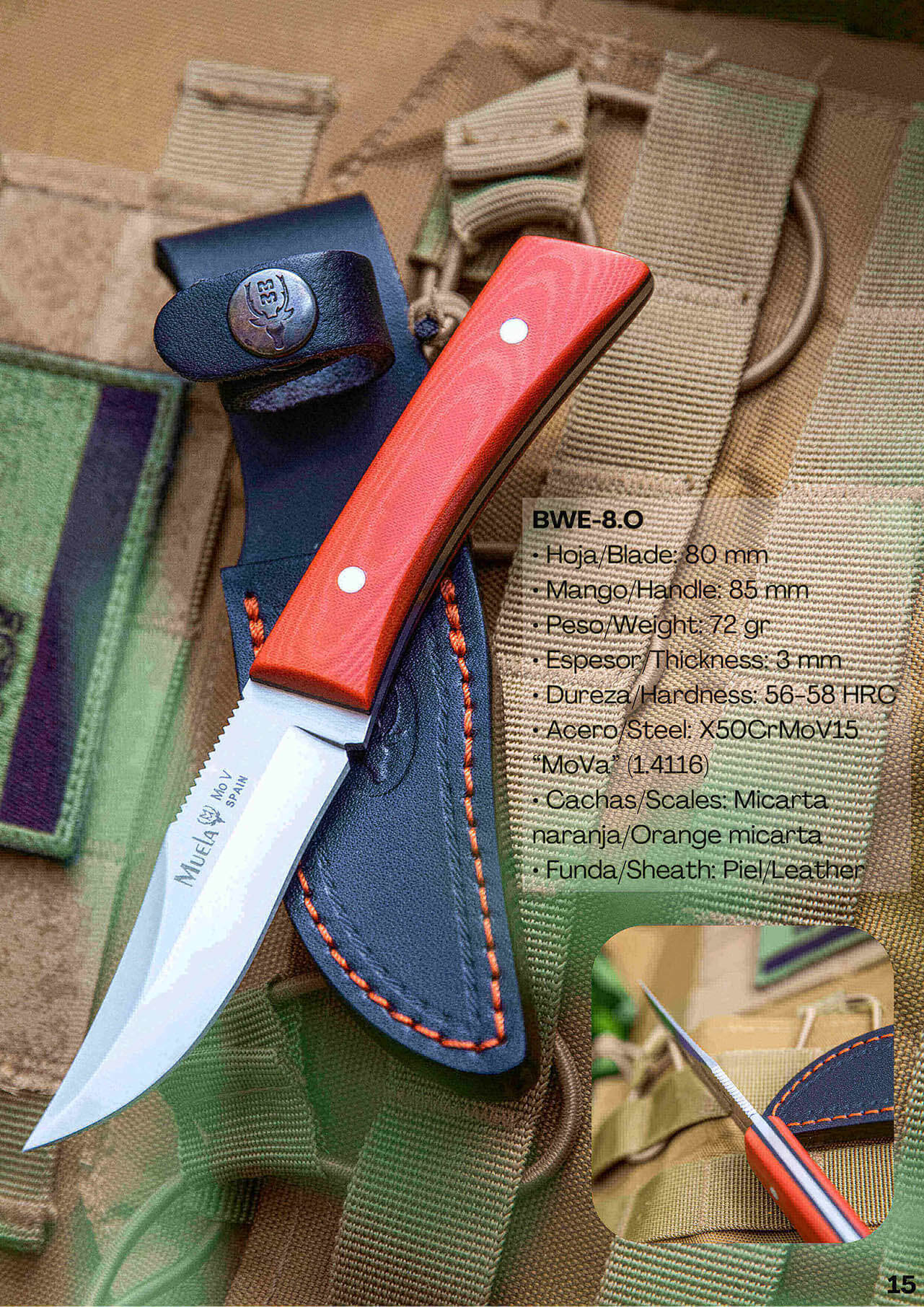 Cuchillo táctico Muela BWE-8.Un cuchillo enterizo con cachas de micarta naranja con separadores negros y hoja enteriza de acero MoVa 1.4116 de 8 cm. Incluye funda de cuero negra.