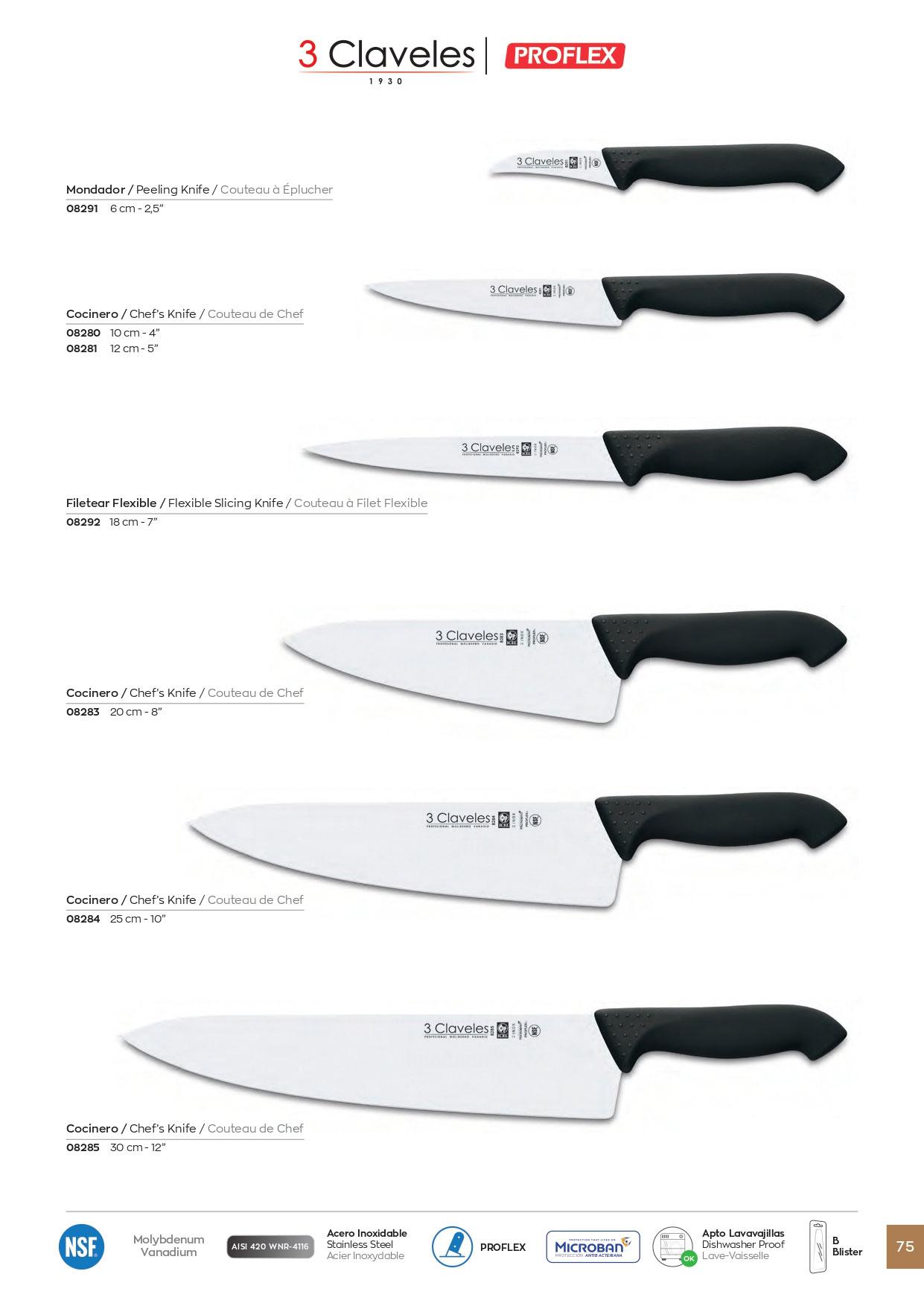 Cuchillo profesional Cocinero de Acero Inoxidable y mango Proflex. Mondador, Cocinero, Cocinero Alveolado, Filetear flexible.