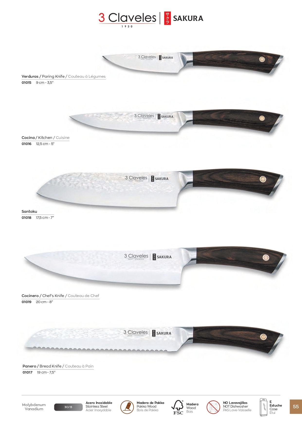 CUCHILLOS COCINA SAKURA. Cuchillos forjados martilleados con hoja de acero inoxidable 3Cr13 y mango de madera de Pakka de gran resistencia al calor y la humedad.