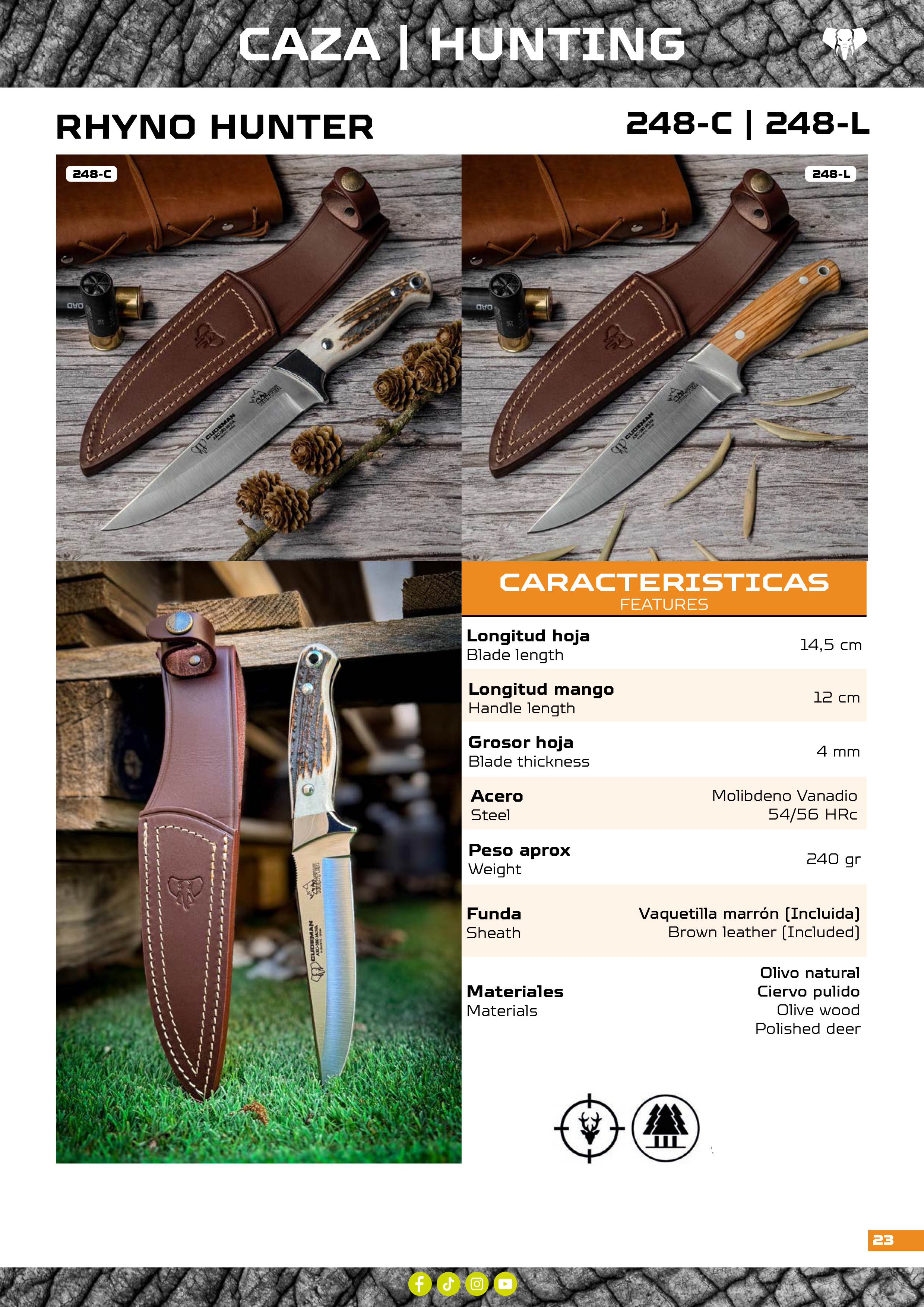 Hoja de acero Molibdeno Vanadio de 15 cm de largo. Longitud total: 26.5 cm. Cuchillo enterizo con cachas de asta de ciervo o madera de olivo. Virola de acero inox A-304 pulida. Grosor de la hoja: 5 mm. Ancho de pala: 3.5 cm. Con funda de cuero marrón incluida.