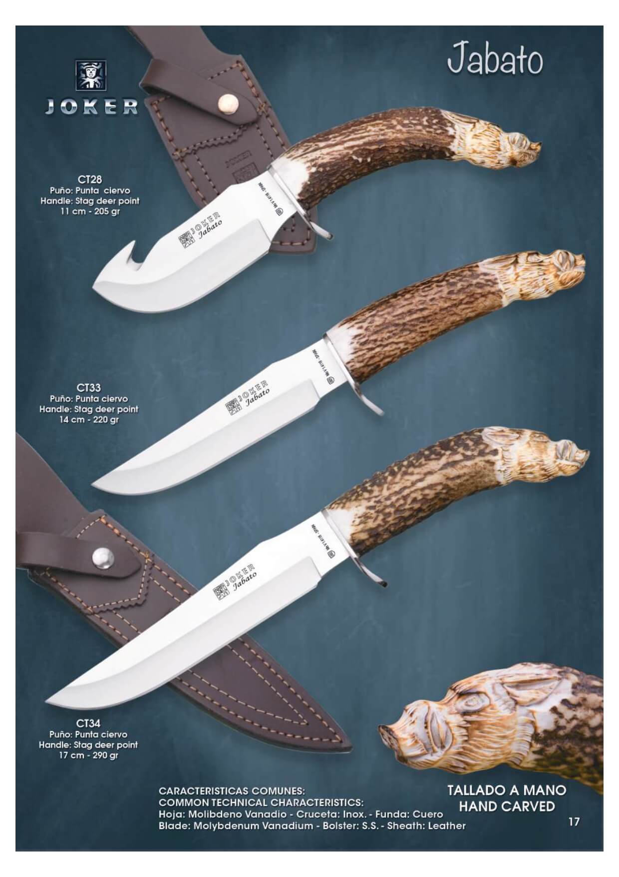 Cuchillo de caza Joker Jabato con puños de asta de ciervo tallado a mano. Hoja de acero Molibdeno Vanadio y cruceta de acero inoxidable. Con funda de cuero marrón.