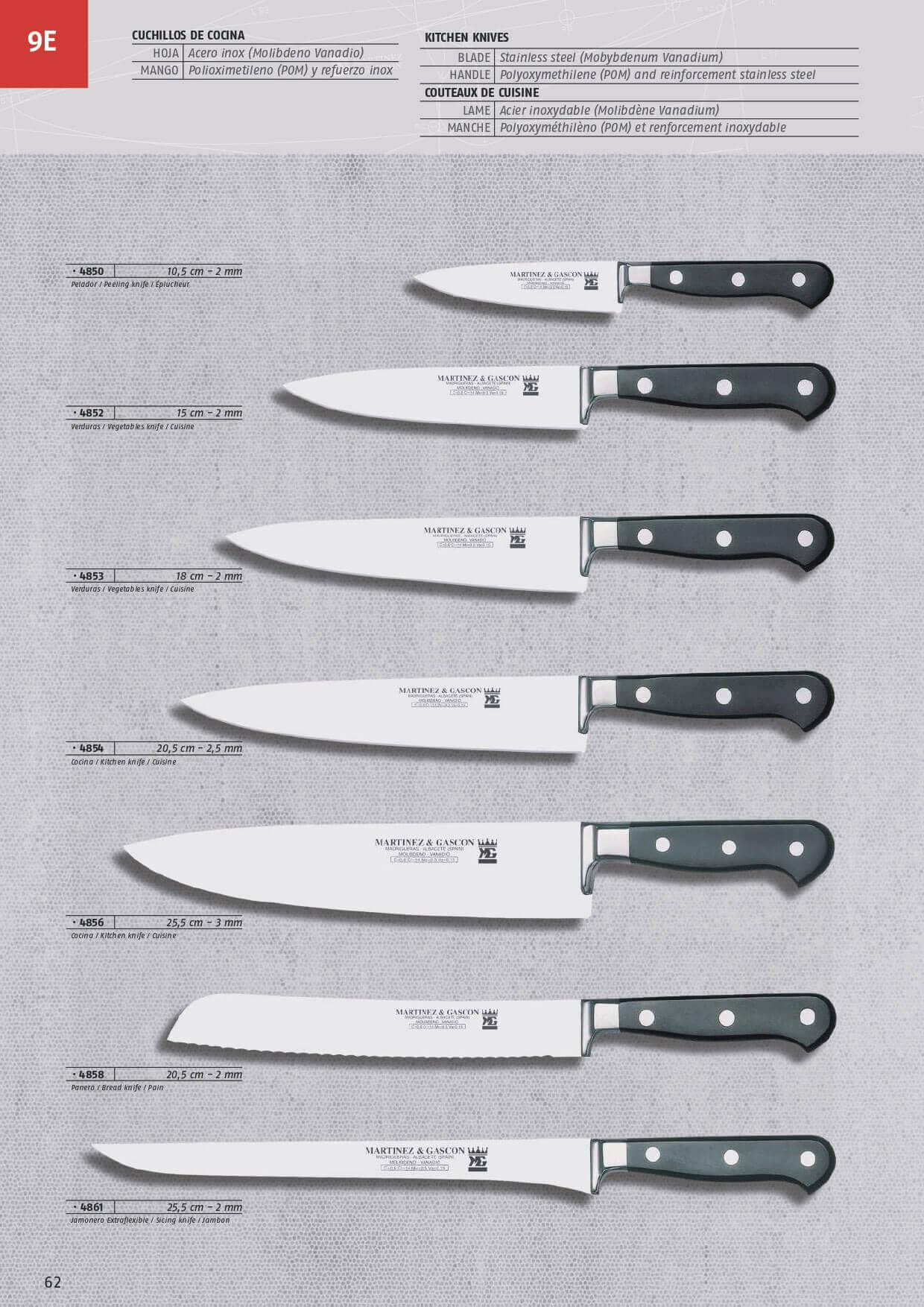 Cuchillos de cocina. Con mangos de polioximetileno, hojas de acero MoVa y refuerzo de acero inoxidable.
