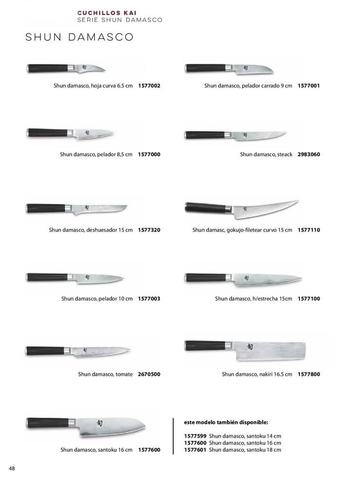 KAI - SHUN DAMASCO. La serie Shun Damasco está formada por cuchillos para cocina fabricados con acero de damasco inoxidable de 32 capas. La capa de núcleo está hecho de acero VG10. Extremadamente duro (61 ± 1 HRC, 1,0% de carbono, 1,5% de cobalto).