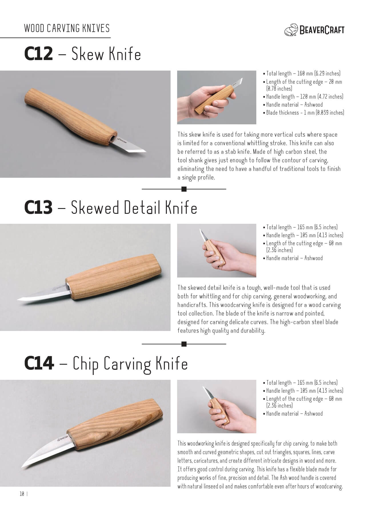 Cuchillos de tallar con hojas de acero carbono y mangos de madera de fresno. Estos cuchillos tienen un diseño especial para poder tallar en partes con poco espacio en la madera, con hojas más estrechas y fáciles de manejar. También podrás hacer formas, geometrías, letras, patrones, etc. Estos cuchillos están diseñados para poder tallar detalles.