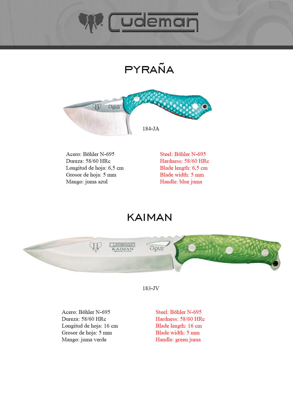 Cuchillos tácticos con hojas de acero Bohler N695 y mango de juma azul con separador naranja o juma verde con separador negro. Incluyen funda de cuero.