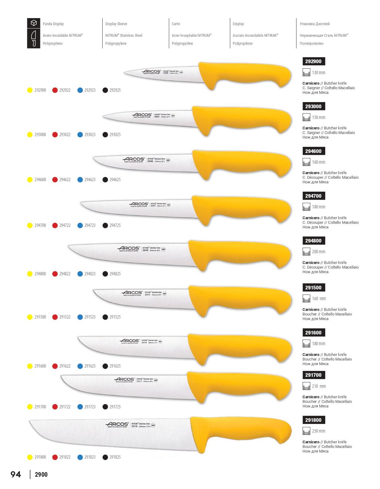 Cuchillos para carnicería con hojas resistentes de acero inoxidable NITRUM. Una serie pensada para los profesionales de la industria, cuchillos económicos, manejables, con variedad de colores para una mejor organización. La serie Arcos 2900 presenta una gran variedad de cuchillos pensados tanto para cocina, carnicería, pastelería, pescadería...