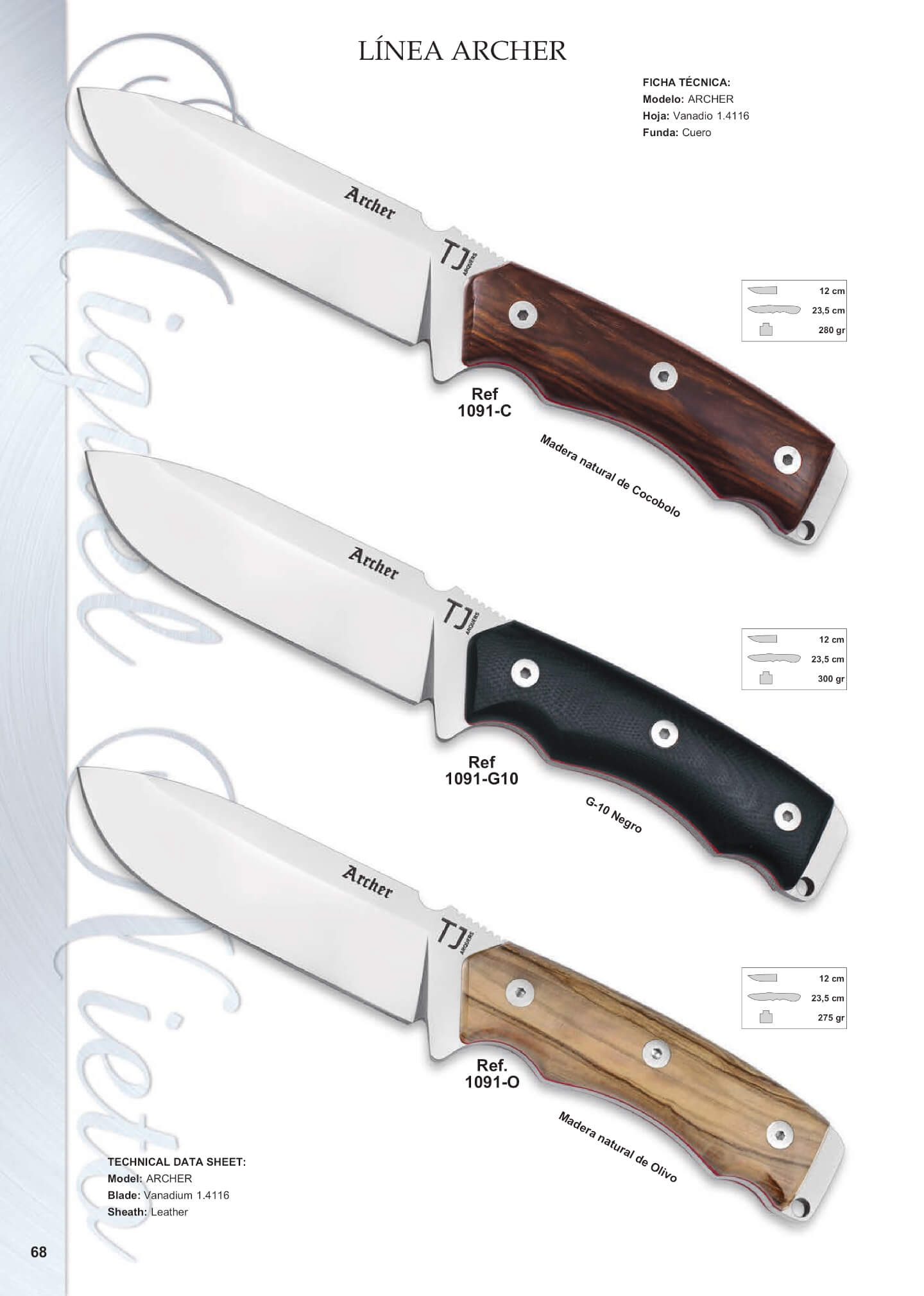 Cuchillos Bushcraft y de supervivencia de la línea Archer. Con hoja de acero MoVa 1.4116 de 12 cm de longitud y 24 cm de longitud total