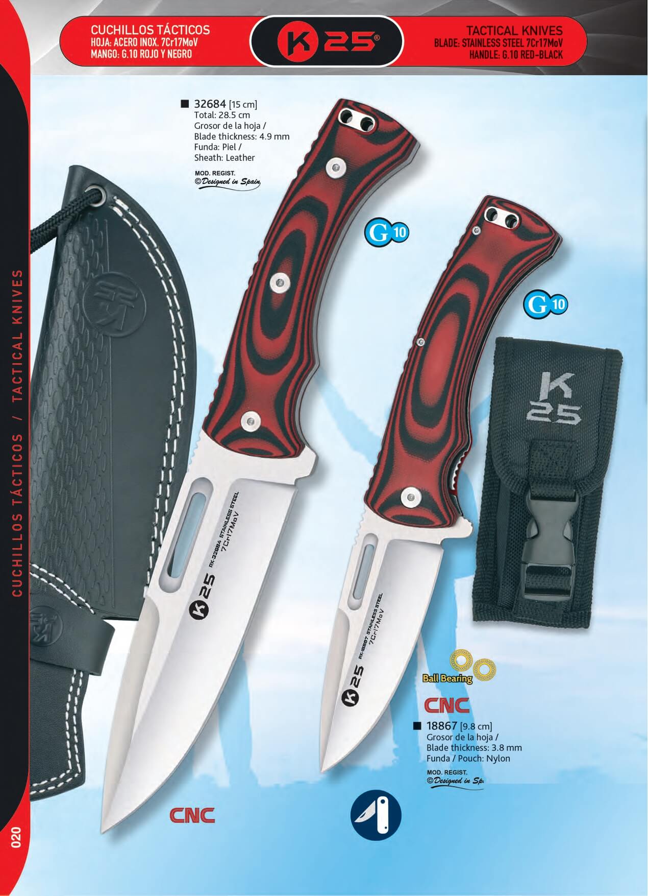 Cuchillo táctico K25 con hoja de 15 cm y mango de G10 rojo y negr...