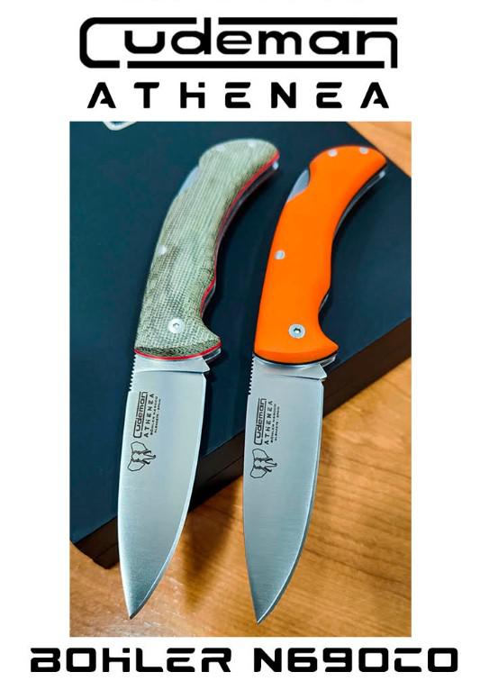 Navaja Cudeman Athenea con hoja de acero Böhler N690Co de 3 mm de grosor. Con bloqueo de botón trasero.