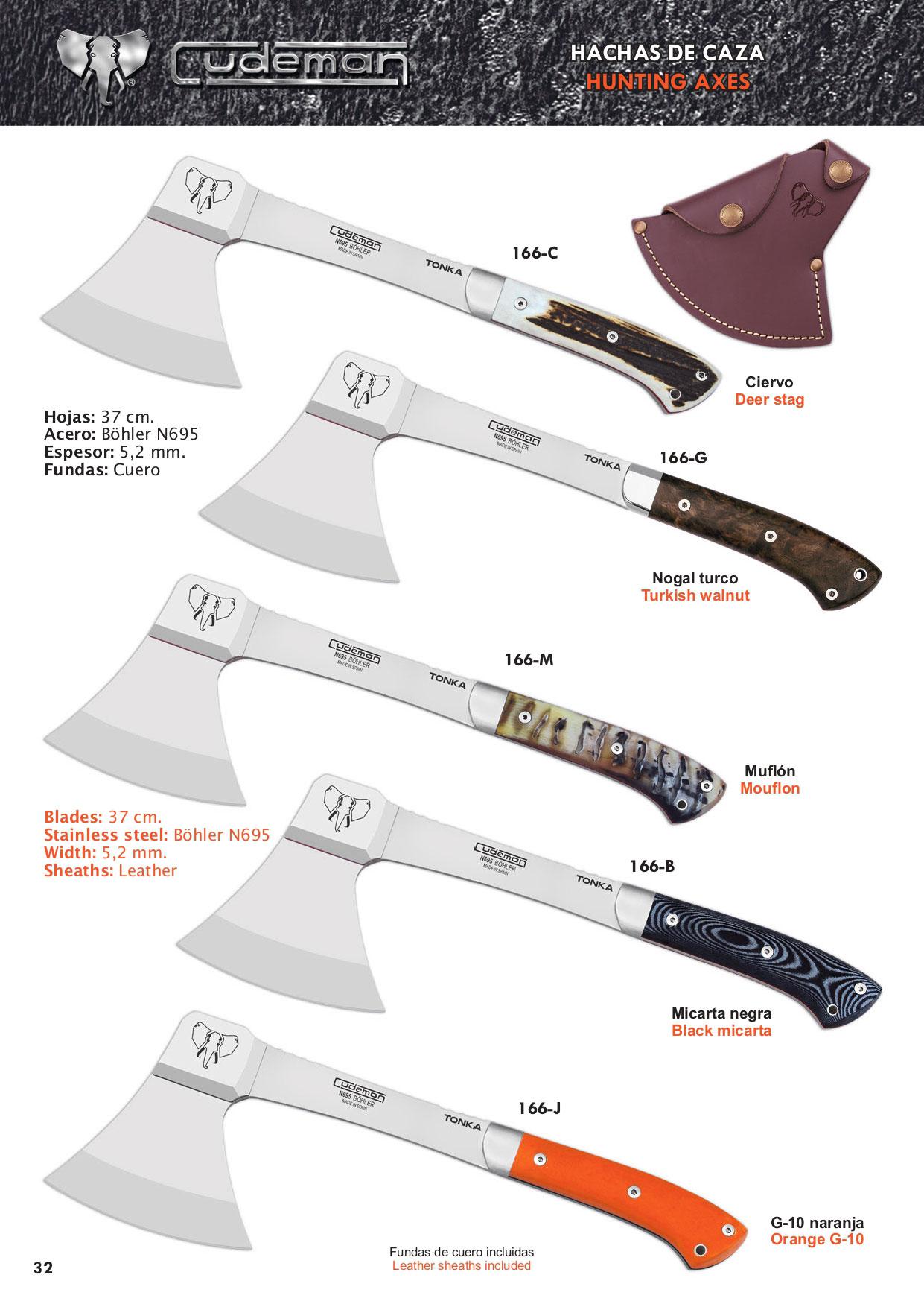 Hachas de caza y supervivencia Tonka con acero Böhler N695 y mango de ciervo, asta rústica, micarta negra, madera de nogal o G-10 naranja. Funda de cuero incluida.
