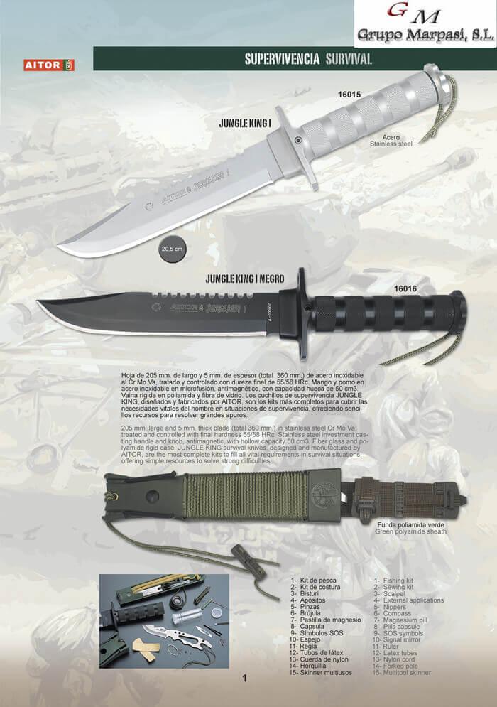 Cuchillo de supervivencia con hoja de acero y funda, incluye en el mango: Kit de pesca, kit de costura, bisturi, apositos, pinzas, lapiz, brujula, pastillas de Magnesio, Capsula, simbolos S.O.S., espejo, regla, tubos de latex, cuerda de nylon, horquilla, skinner multiusos.