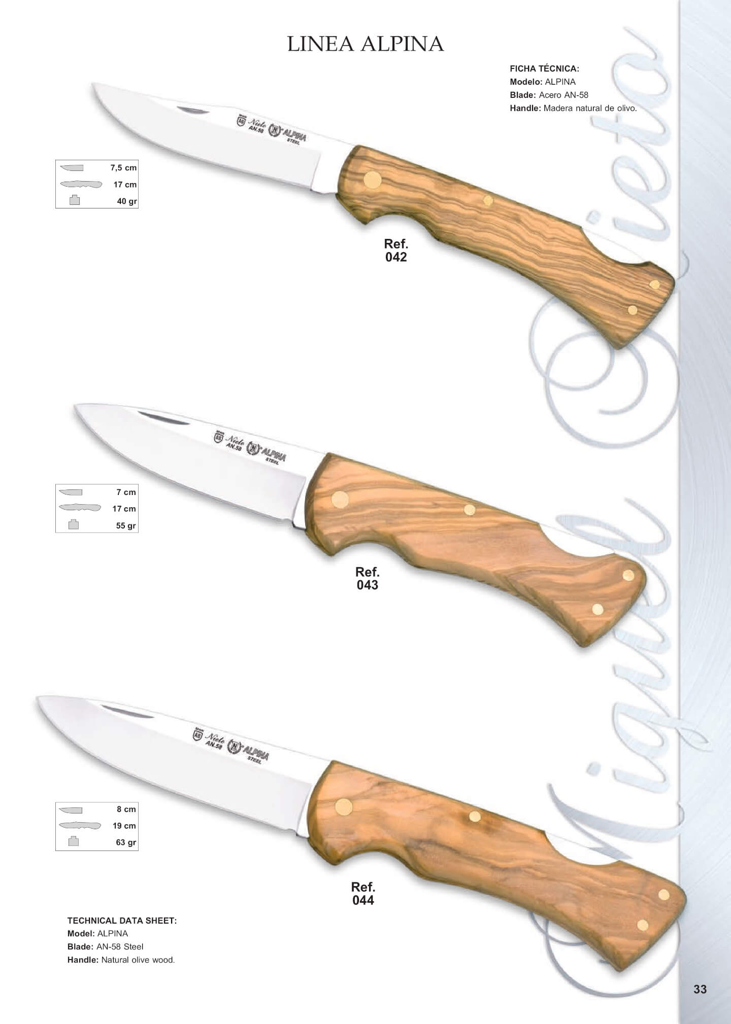Mango: madera natural de olivo. Hoja: 8 cm. Longitud total: 19 cm. Peso: 63 grs.