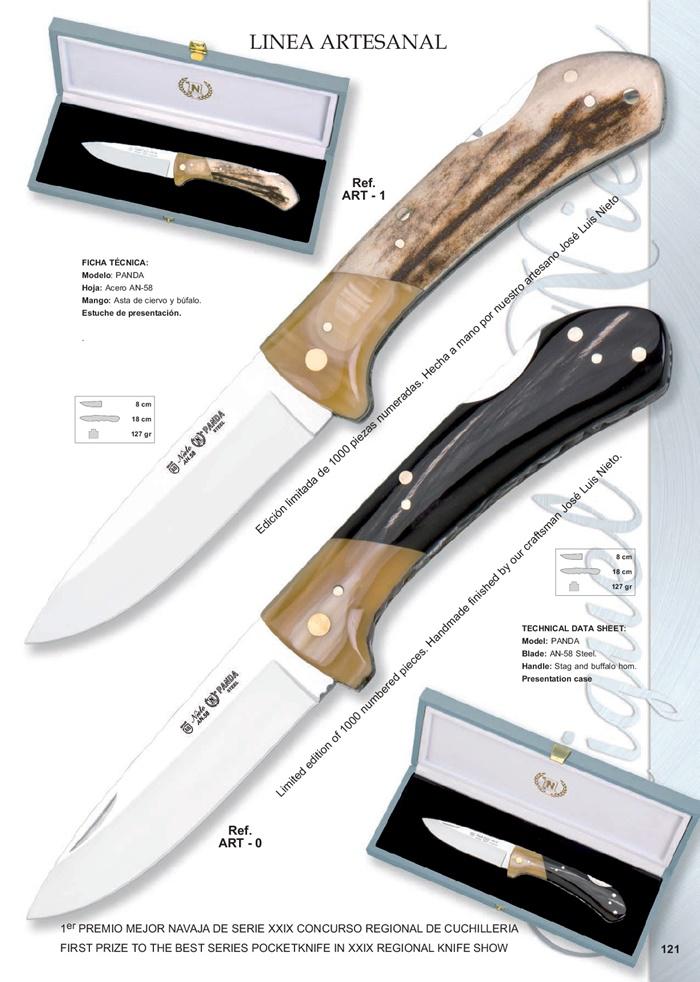 Linea artesanal.Hecha a mano, por el artesano Jose Luis Nieto.1000 piezas numeradas.Hoja de acero AN58.Longitud hoja 8 cm. Total 18 cm. Peso 127 gr.Estuche de presentación.ART-0 Mango de bufalo.ART-1 Mango de asta de ciervo.