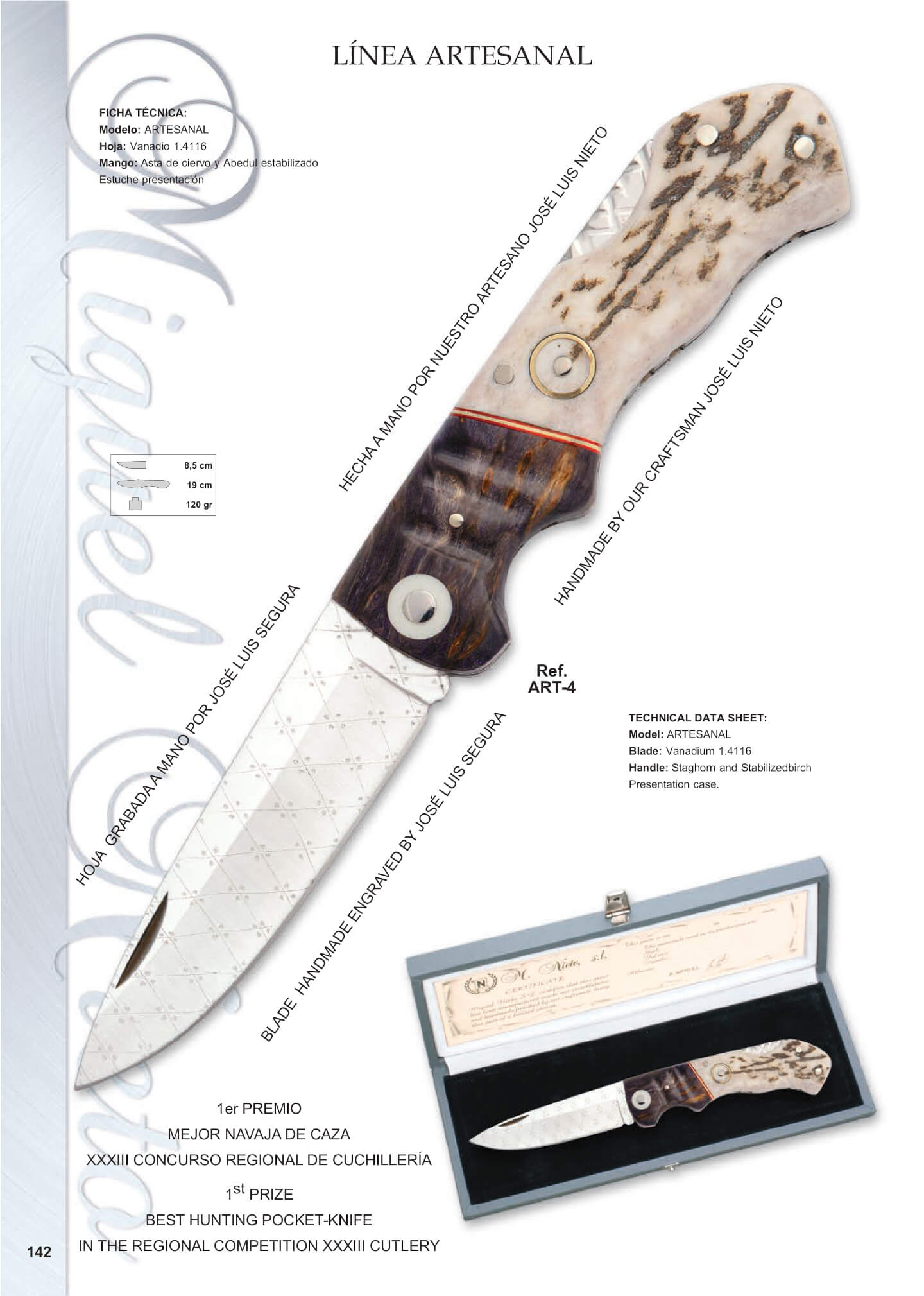 Longitud hoja 8,5 cm. Total 19 cm. Peso 120 gr.