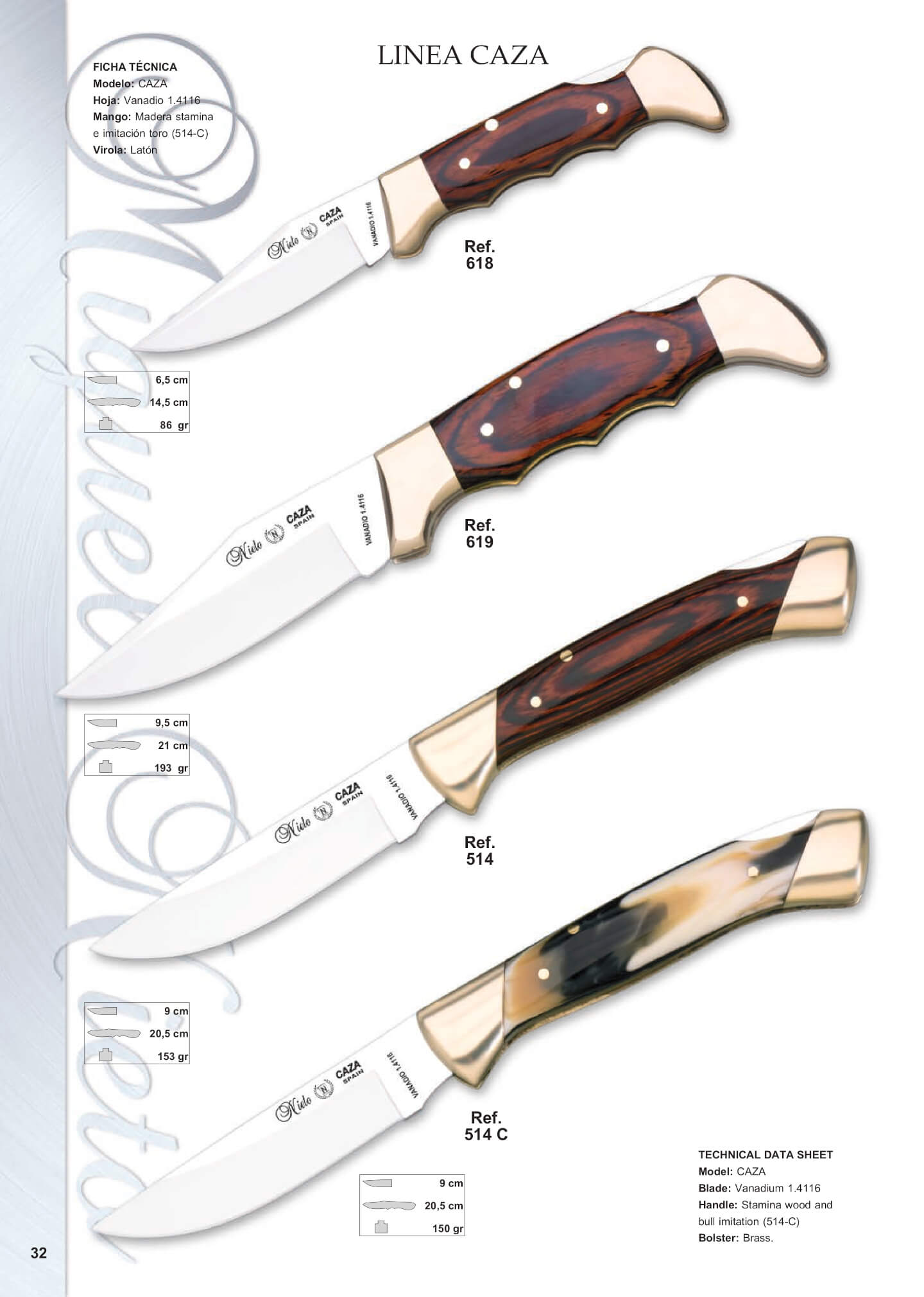 Mango: madera de estamina. Virola: latón. Hoja: 9 cm. Longitud total: 20.5 cm. Peso: 153 grs.