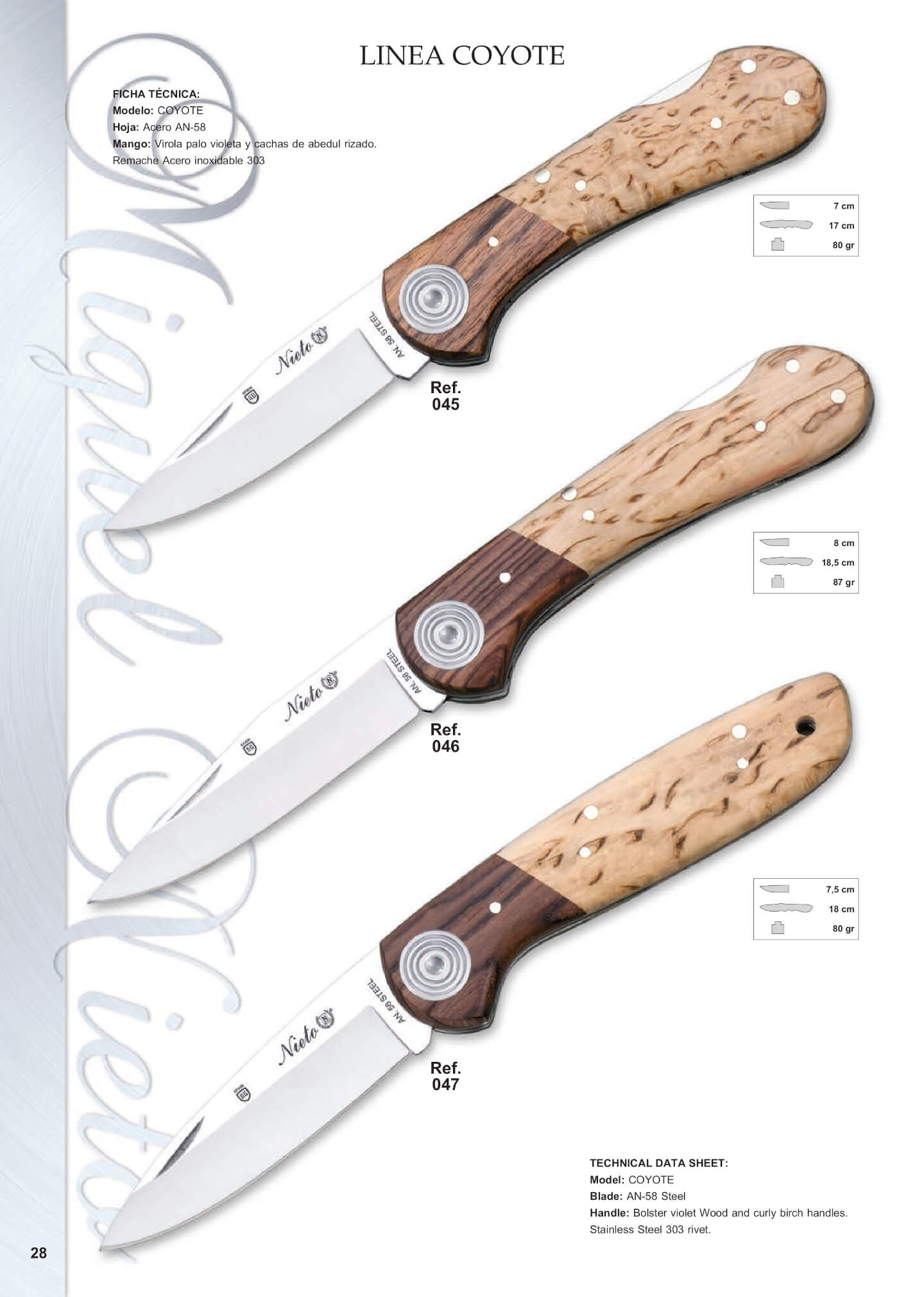Navajas M. Nieto, línea coyote. Hoja de acero AN58. Mango: virola de palovioleta y cachas de abedul rizado. 045 Hoja: 7 cm. Longitud total: 17 cm. Peso 80 gr. 046 Hoja: 8 cm. Longitud total: 18.5 cm. Peso 87 gr. 047 Hoja: 7.5 cm. Longitud total: 18 cm. Peso 80 gr.