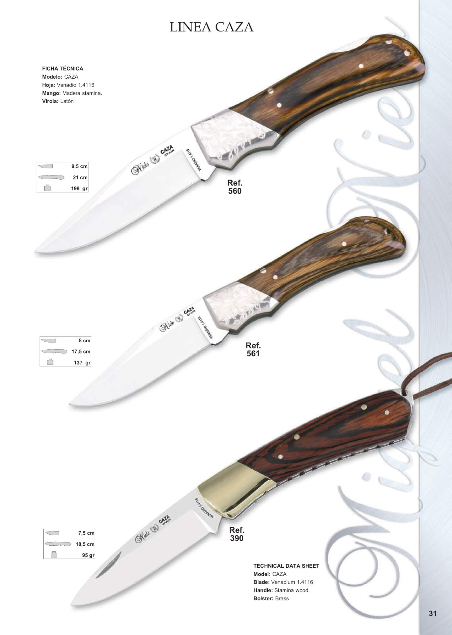Navajas M. nieto. Linea Caza. Hoja de acero AN58, mango de madera de estamina con virola de alpaca.560Hoja: 9.5 cm. Longitud total: 21 cm. Peso 198 grs.561Hoja: 8 cm. Longitud total: 17.5 cm. Peso 137 grs.