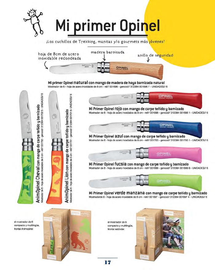 Hoja de acero inoxidable de 8 cm. Punta redondeada. Bloqueo: Anilla de seguridad. 001696 Mi primer "Opinel" con mango de madera natural de haya barnizada natural. 001698 Mi primer "Opinel" rojo con mango de carpe teñido y barnizado. 001700 Mi primer "Opinel" ver manzana con mango de carpe teñido y barnizado. 001699 Mi primer "Opinel" fucsia con mango de carpe teñido y barnizado. 001697 Mi primer "Opinel" azul con mango de carpe teñido y barnizado.