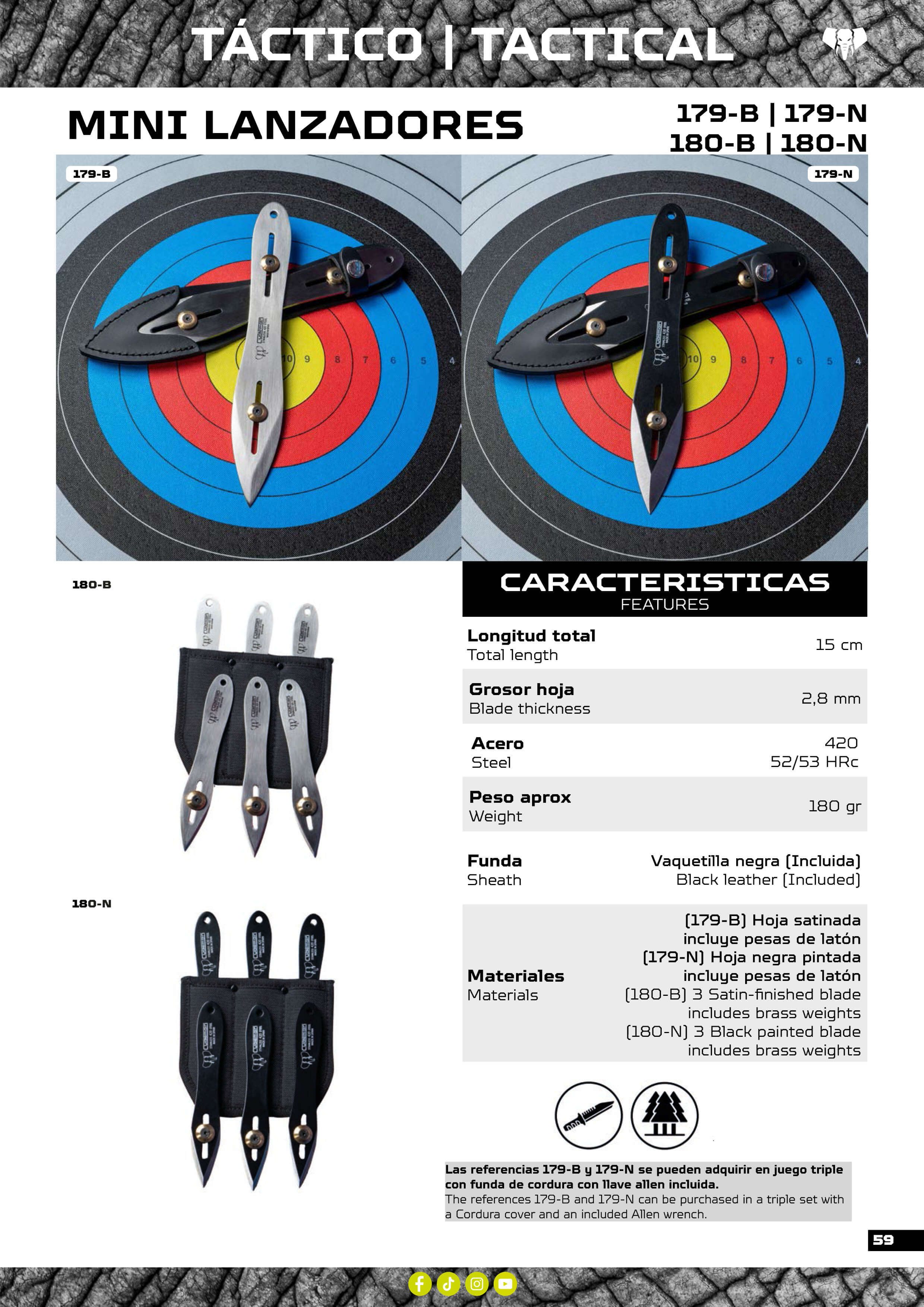 Cuchillos lanzadores de 15 cm (179). Acero inoxidable 420. Con funda de cuero negro.(180) Set de 3 lanzadores de 15 cm con funda de cordura.