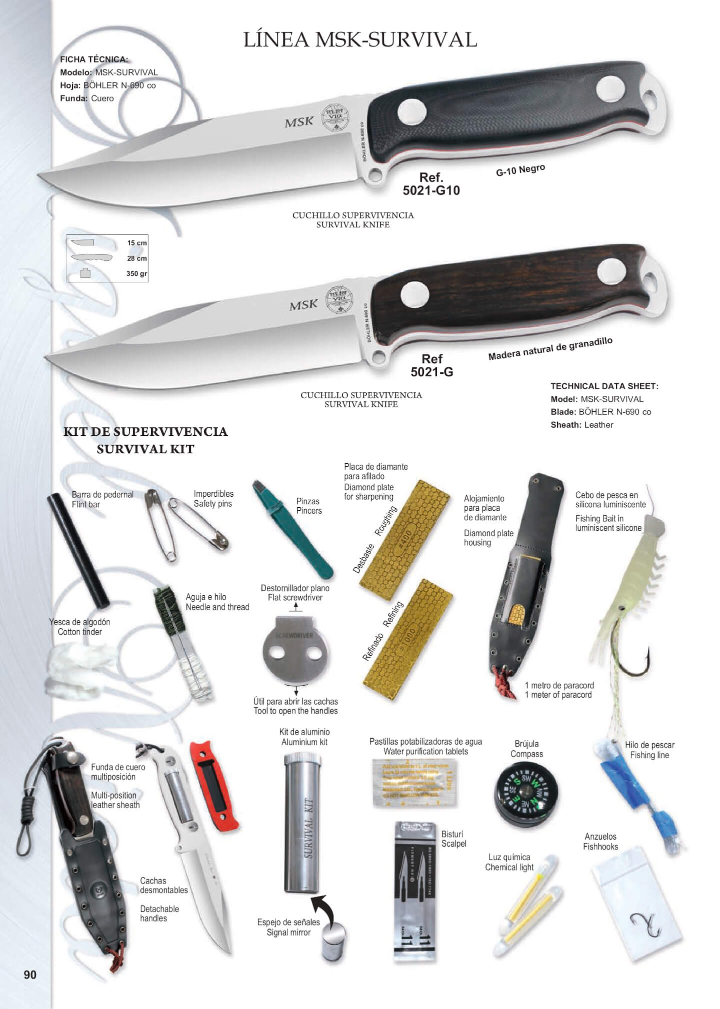 Cuchillo de supervivencia Nieto MSK Survival.Un cuchillo táctico con hoja enteriza de acero Böhler N690Co de 15 cm. Incluye un kit de supervivencia compuesto de: