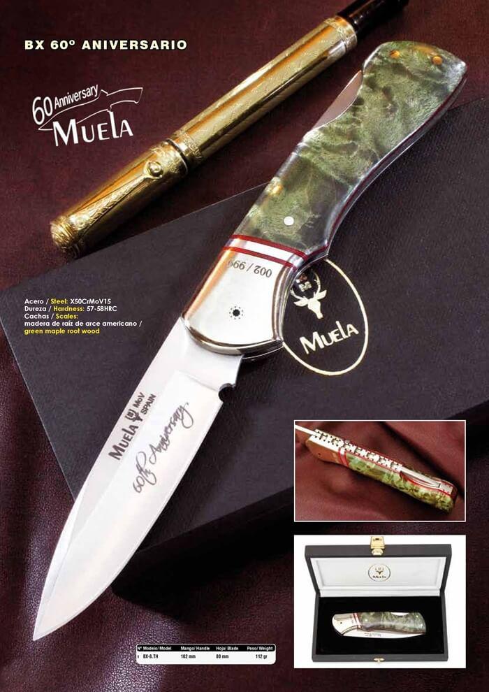 La navaja BX-8 es una edición limitada a 999 piezas, fabricada para celebrar el 60 aniversario de la marca Muela. Se trata de una pieza fabricada en acero X50CrMoV15 y mango en madera de raíz de arce americano, con el número del artículo de la serie grabado en la virola de la navaja. Se incluye un estuche de presentación de regalo.